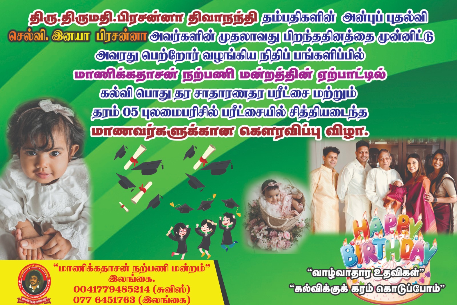 இன்றைய நாளில் இனிய முதலாவது பிறந்தநாளைக் கொண்டாடும் “செல்வி.இனயா பிரசன்னா” அவர்கள் தேக ஆரோக்கியத்துடன், கலைகளில், கல்வியில் சிறந்து உயர்வடையவும், சீரிய பண்புகளோடு, நல்ல மனிதமுள்ள புரட்சிப் பெண்ணாக பெற்றோருக்கு பேரும் புகழும் சேர்க்க வேண்டும்” என தாயக உறவுகளோடு, இணைந்து மாணிக்கதாசன் நற்பணி மன்றமும் வாயார வாழ்த்தி பெருமை கொள்கிறது..