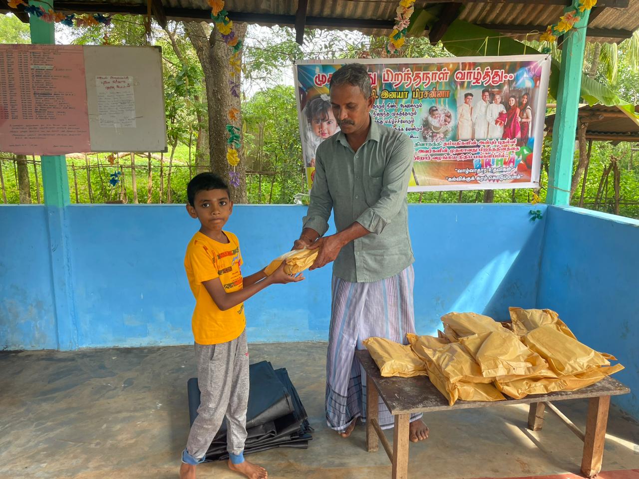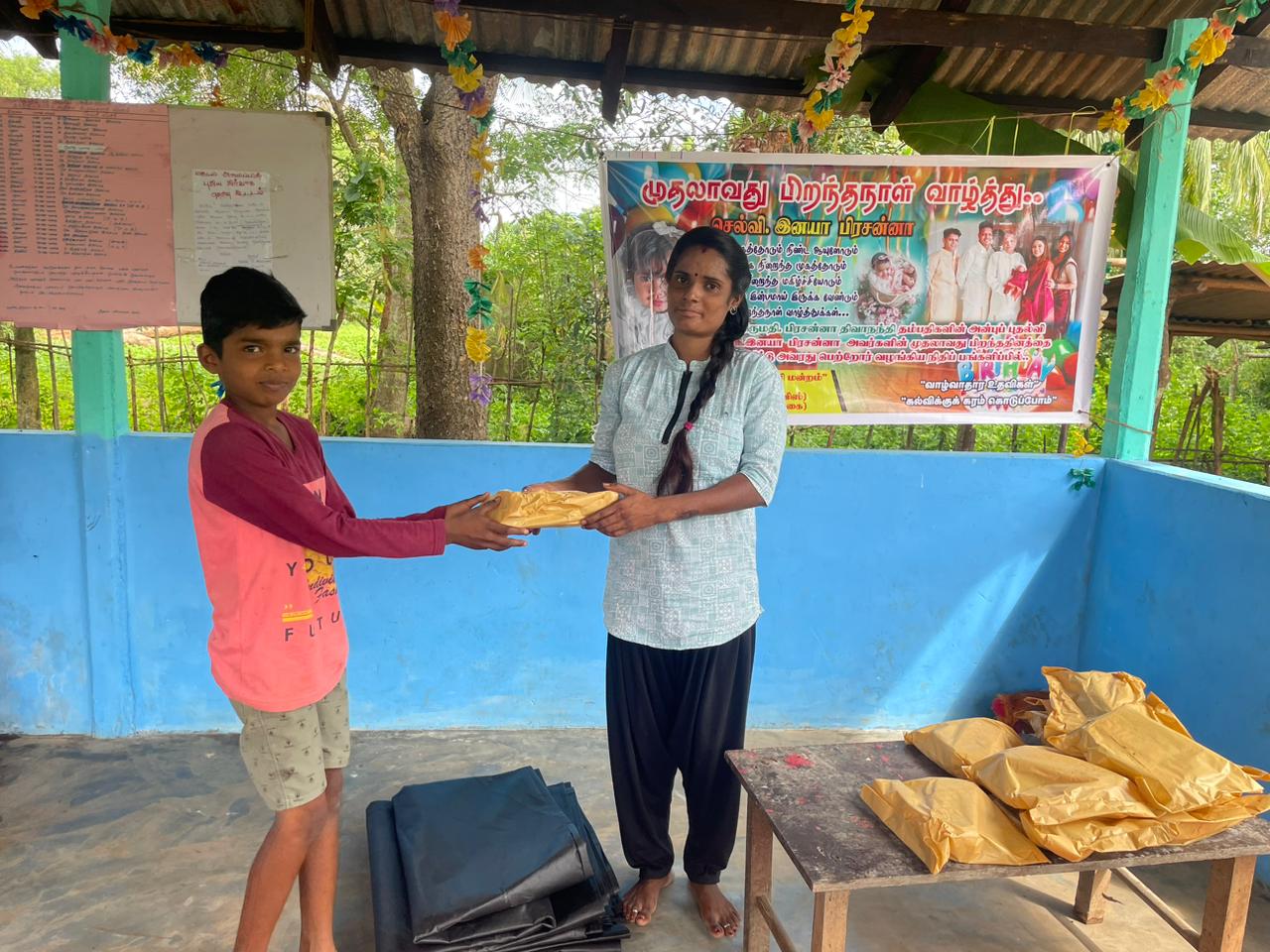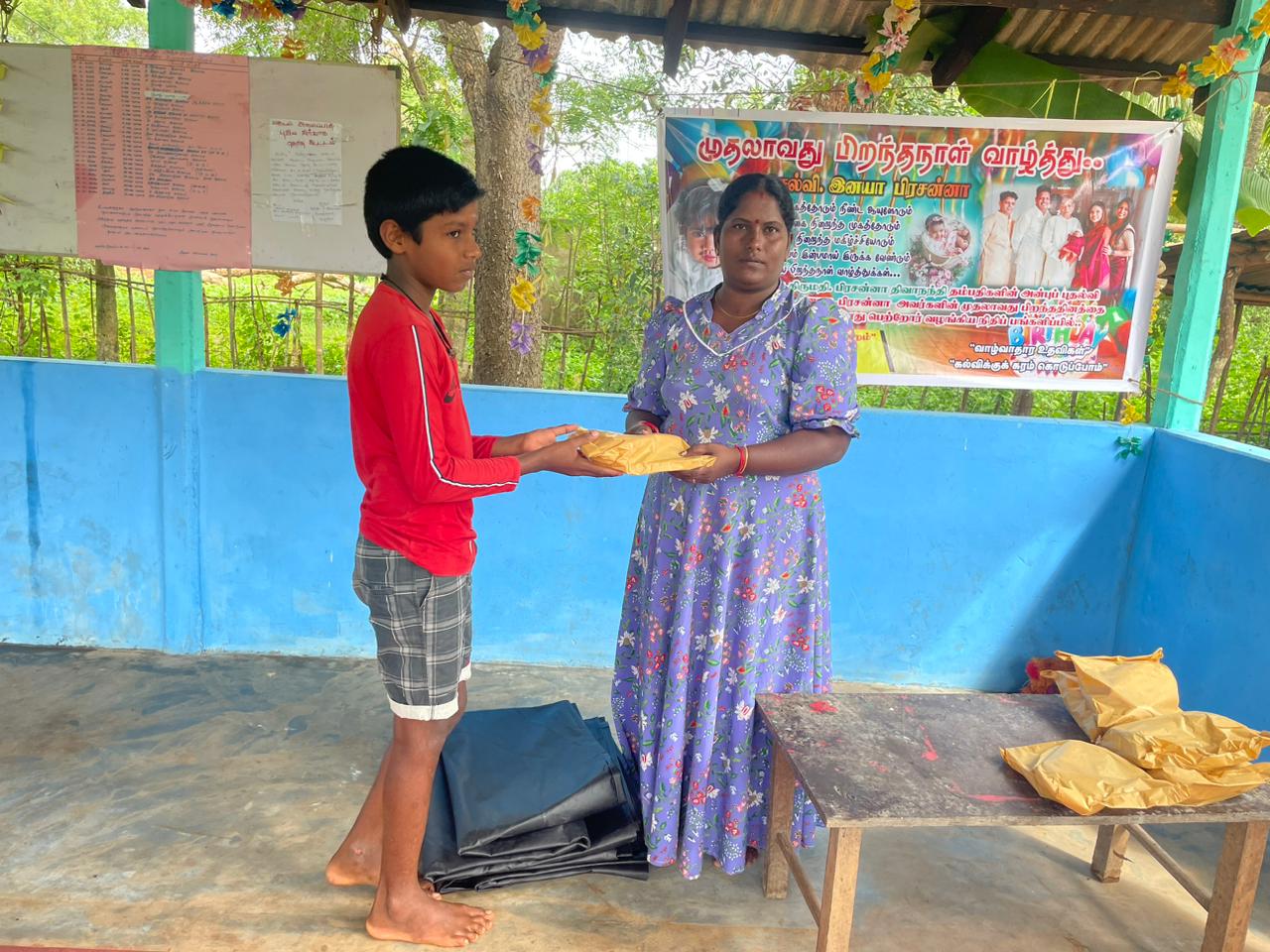 இதனைத் தொடர்ந்து வவுனியா ஆச்சிபுரம் கழகத்தின் செயற்பாட்டாளரான திருமதி.பிரியங்கா அவர்கள் கழகத்தின் வவுனியா மாவட்ட அமைப்பாளர் திரு.சந்திரகுலசிங்கம் மோகன் அவர்கள் ஊடாக முன்வைத்த கோரிக்கையை “மாணிக்கதாசன் நற்பணி மன்றத்திடம்” முன்வைத்ததை அடுத்து, பிறந்தநாள் கொண்டாடும் செல்வி.இனயா பிரசன்னா அவர்களின் தாத்தா திரு.பேரின்பநாதன் அவர்களிடம் தெரிவித்ததை அடுத்து செல்வி.இனயா பிரசன்னா அவர்களின் பெற்றோரின் முழுமையான நிதிப் பங்களிப்பில், இன்றையதினம் வவுனியா ஆனந்தபுரம் முருகனூர் ஆதிபராசக்தி அறநெறி பாடசாலை மாணவர்களுக்கான கற்றல் உபகரணங்கள் கையளிப்பு நிகழ்வு நடைபெற்றதும், அத்துடன் தற்போது பெய்து வரும் கடும் மழையினால் தமது வீட்டுக்கூரையின் நிலையை கருத்தில் கொண்டு முன்வைத்த இரண்டு குடும்பத்தினரின் வேண்டுகோளுக்கு இணங்க தறப்பாள்களும் வழங்கி வைக்கப்பட்டது.