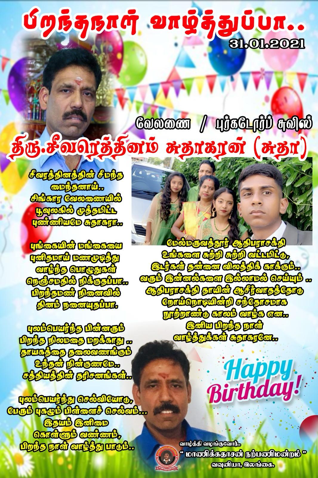 இன்றைய நாளில் பிறந்த நாளைக் கொண்டாடும் சுதாகரன் அவர்களுக்கு நிகழ்வில் கலந்து கொண்ட சிறியோர் முதல் பெரியோர் வரையான தாயக உறவுகளோடு மாணிக்கதாசன் நற்பணி மன்றமும் தனது இனிய பிறந்தநாள் வாழ்த்துக்களை தெரிவித்துக் கொள்வதோடு அவரது குடும்பத்தின் அனைத்து நிகழ்வுகளையும் மாணிக்கதாசன் நற்பணி மன்றமூடாக வாழ்வாதார உதவிகள் வழங்கி தாயக மக்களுடன் இணைந்து தொடர்ச்சியாக முன்னெடுத்து வரும் சமூக நற்பணிகளுக்காக வாழ்த்துக்களையும் நன்றிகளையும் தெரிவித்துக் கொள்கிறது.