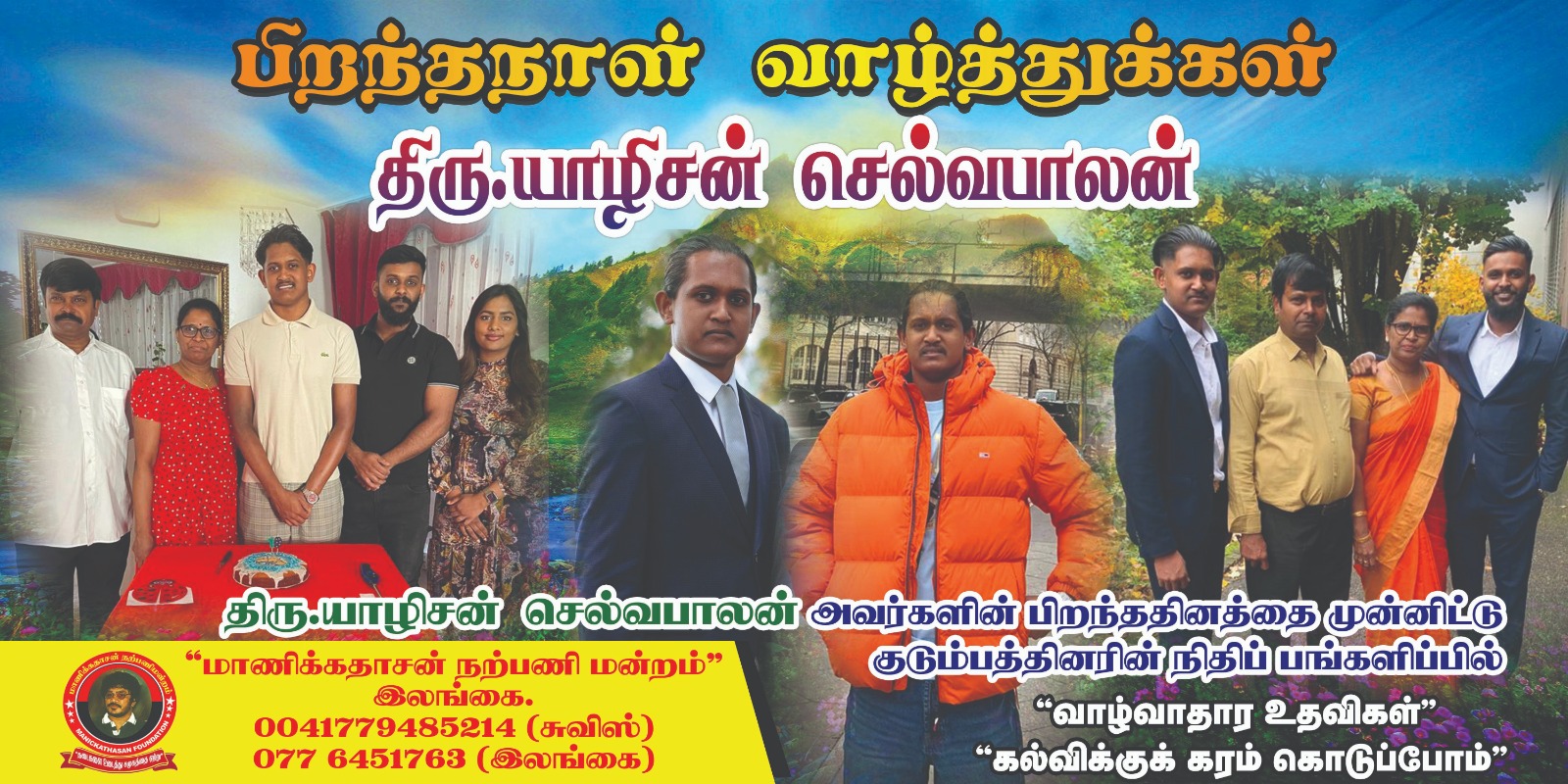 தமது இனிதான பிறந்தநாளினைக் கொண்டாடிய சுவிஸ் செல்வபாலன் மனோகரி தம்பதிகளின் புதல்வன் செல்வன்.யாழிசன் அவரது பெற்றோர், அவரது அண்ணா ஈழதர்ஷன், அண்ணி லெவீனா மற்றும் உற்றார் உறவினர்கள் நண்பர்களுடன் இணைந்து வாழ்த்துக்களைத் தெரிவிக்கும் தாயக உறவுகளோடு மாணிக்கதாசன் நற்பணி மன்றமும் “சகல களையும் கற்று பெருவாழ்வு வாழ வாழ்த்துவதோடு” அவரது பெற்றோரின் நிதிப் பங்களிப்பில் நடைபெறும் சமூகநல திட்டங்கள் மேலும் தொடரவும் பல்கிப் பெருகவும் வாழ்த்துக்களையும் நன்றியினையும் தெரிவித்துக் கொள்கின்றோம்.