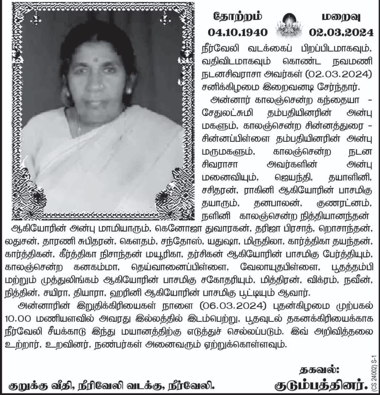 அமரத்துவமடைந்த அமரத்துவமடைந்த அமரர் திருமதி நடனசிவராசா நவமணி அவர்களின் 31 ந் நாள் நினைவேந்தலில் அவரின் ஆத்மசாந்திக்காக இறைவனை வேண்டி, தாயக உறவுகளோடு, மாணிக்கதாசன் நற்பணி மன்றமும் ஆழ்ந்த இரங்கலோடு அஞ்சலி செலுத்துவதோடு அமரத்துவமடைந்த அமரர் திருமதி நடனசிவராசா நவமணி அவர்களின் நினைவு நிகழ்வுக்கு நிதிப் பங்களிப்பினை வழங்கிய அவரது மகள் திரு.திருமதி தயாளினி குணரெட்ணம் குடும்பத்துக்கு தாயக உறவுகளுடன் இணைந்து “மாணிக்கதாசன் நற்பணி மன்றமும்” தனது மேலான நன்றியினைத் தெரிவித்துக் கொள்கிறது.