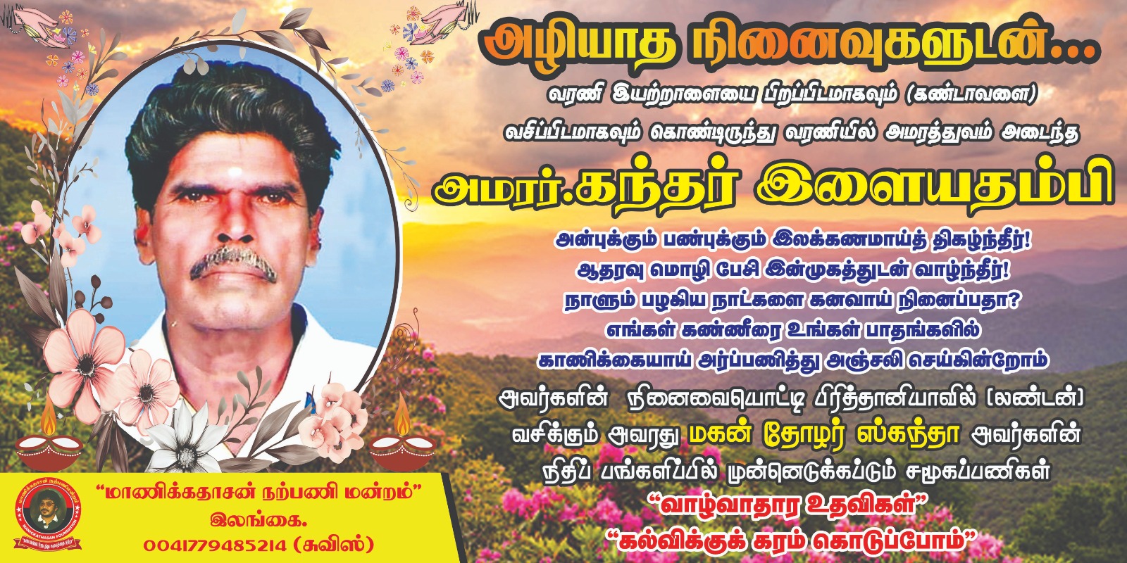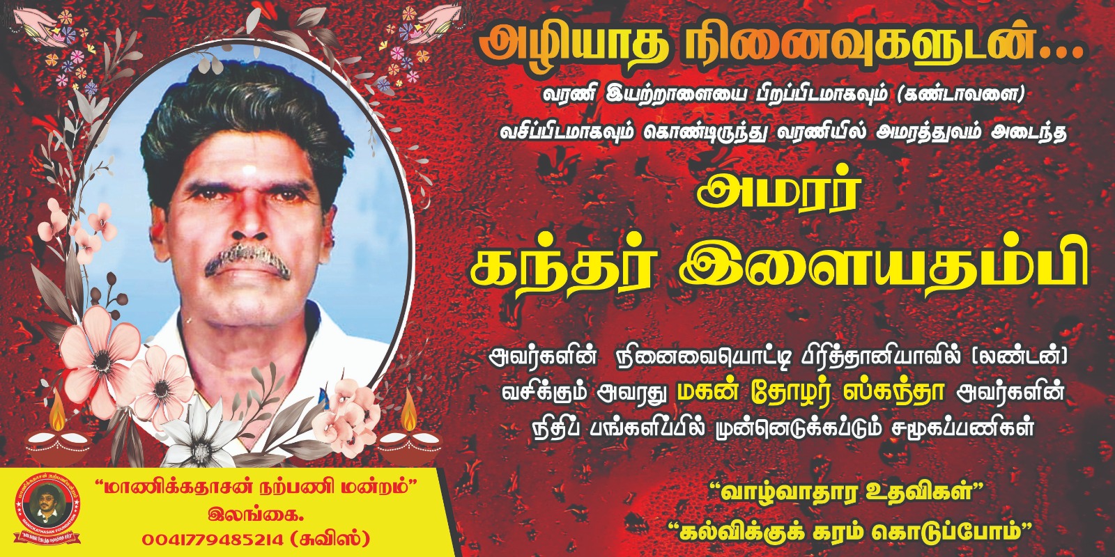 அமரத்துவமடைந்த அமரர்.”வரணி” கந்தர் இளையதம்பி அவர்களுக்கு தாயக உறவுகளோடு, மாணிக்கதாசன் நற்பணி மன்றமும் ஆழ்ந்த இரங்கலோடு “அவரின் ஆத்மா சாந்தியடைய வேண்டி” அஞ்சலி செலுத்துவதோடு