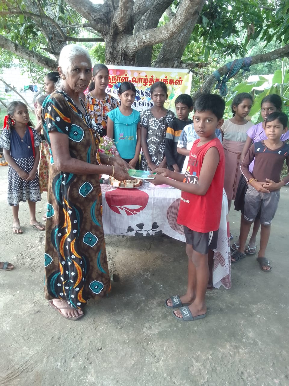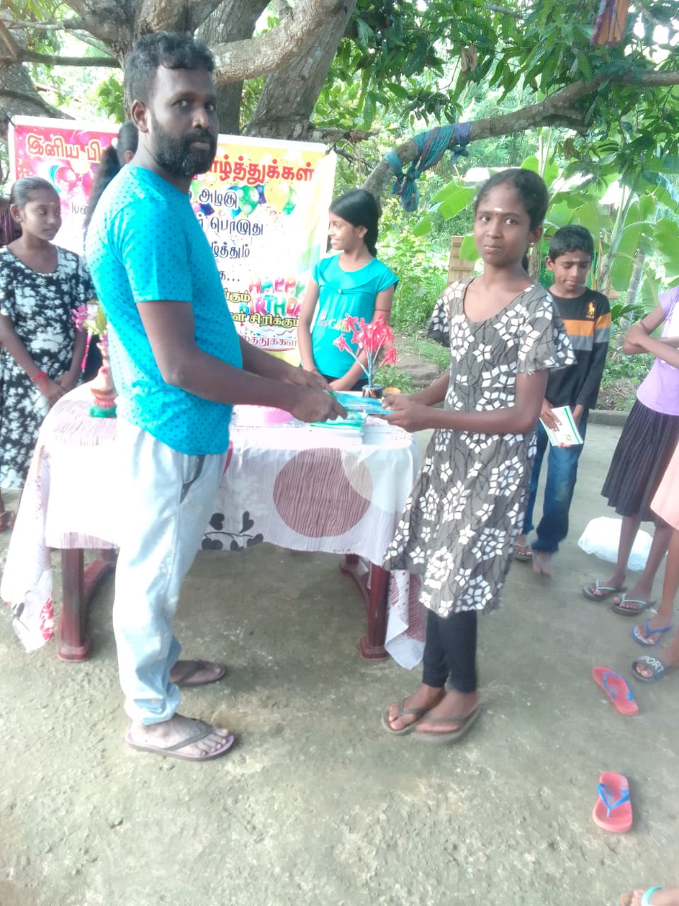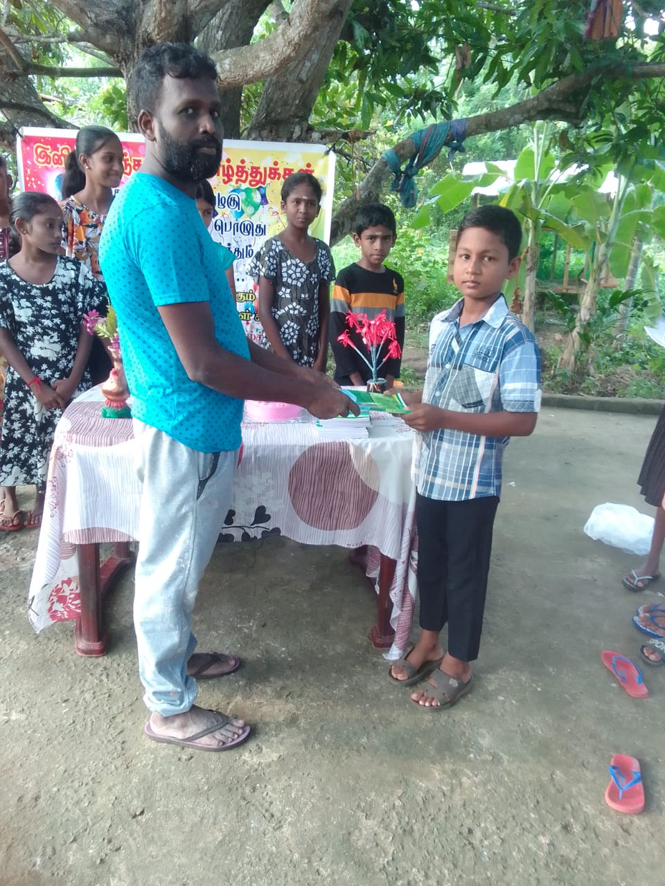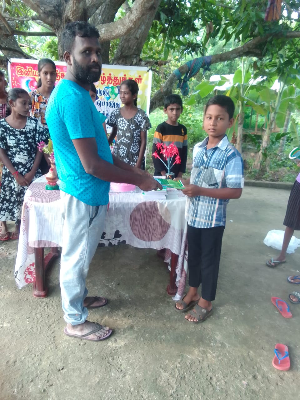 இத்துடன் திரு.திருமதி பாபு மீரா தம்பதிகள் தங்கள் ஏகபுதல்வனான கோபியின் பிறந்த நாளை முன்னிட்டு அக்கிராமத்தில் உள்ள மாலைநேர வகுப்புக்கு செல்லும் மாணவ மாணவிகளுக்கு கற்றலுக்கான அப்பியாசக் கொப்பிகள் வழங்கி வைத்தனர்.