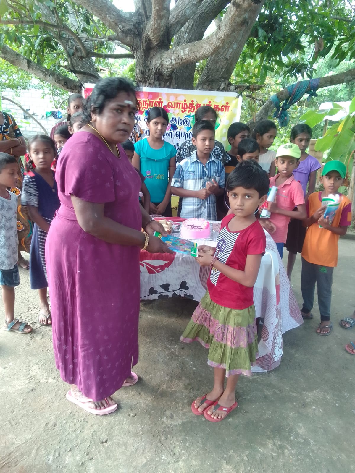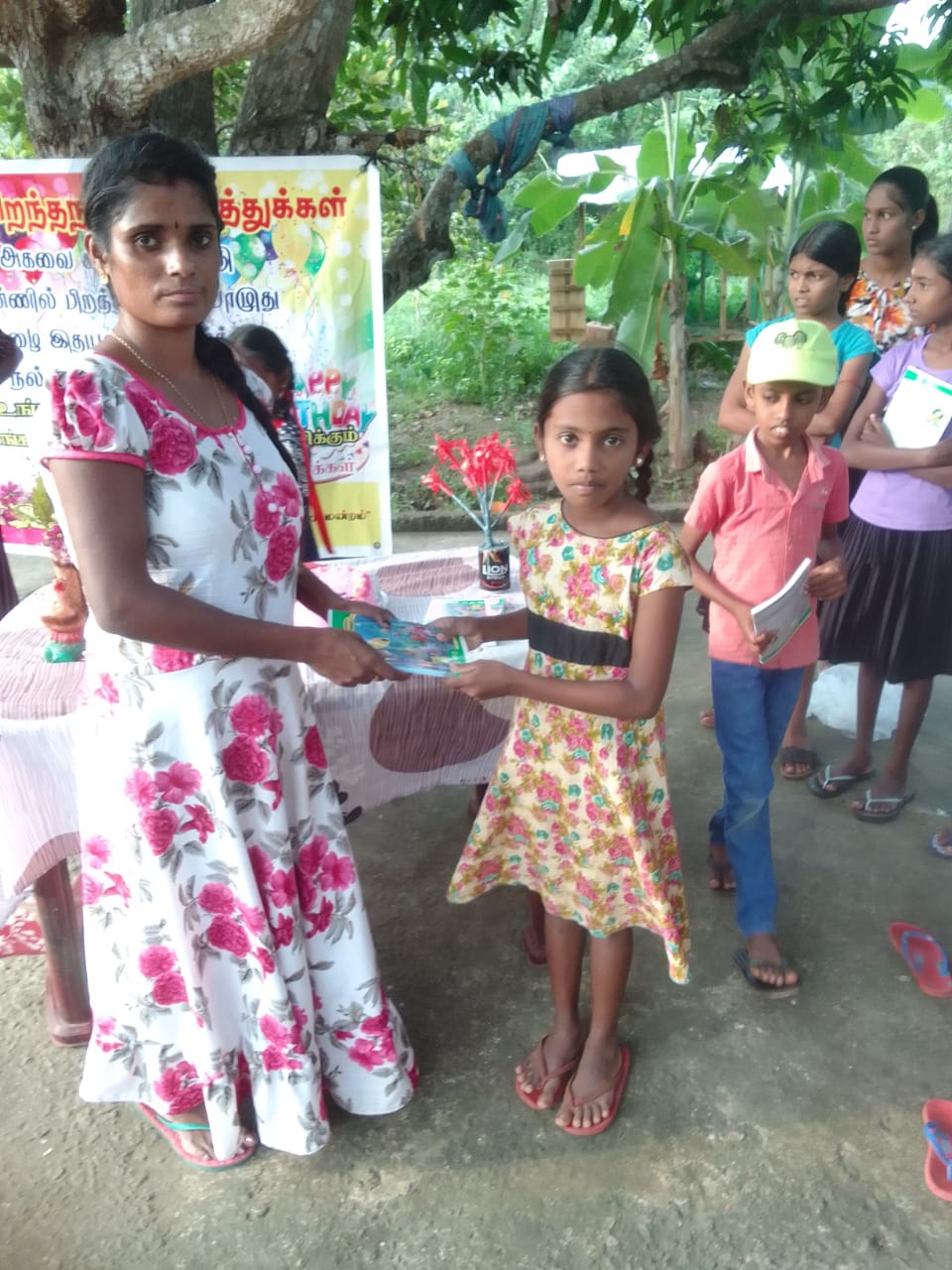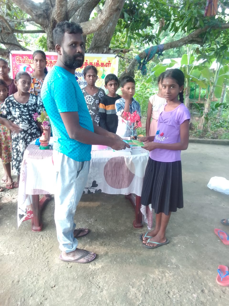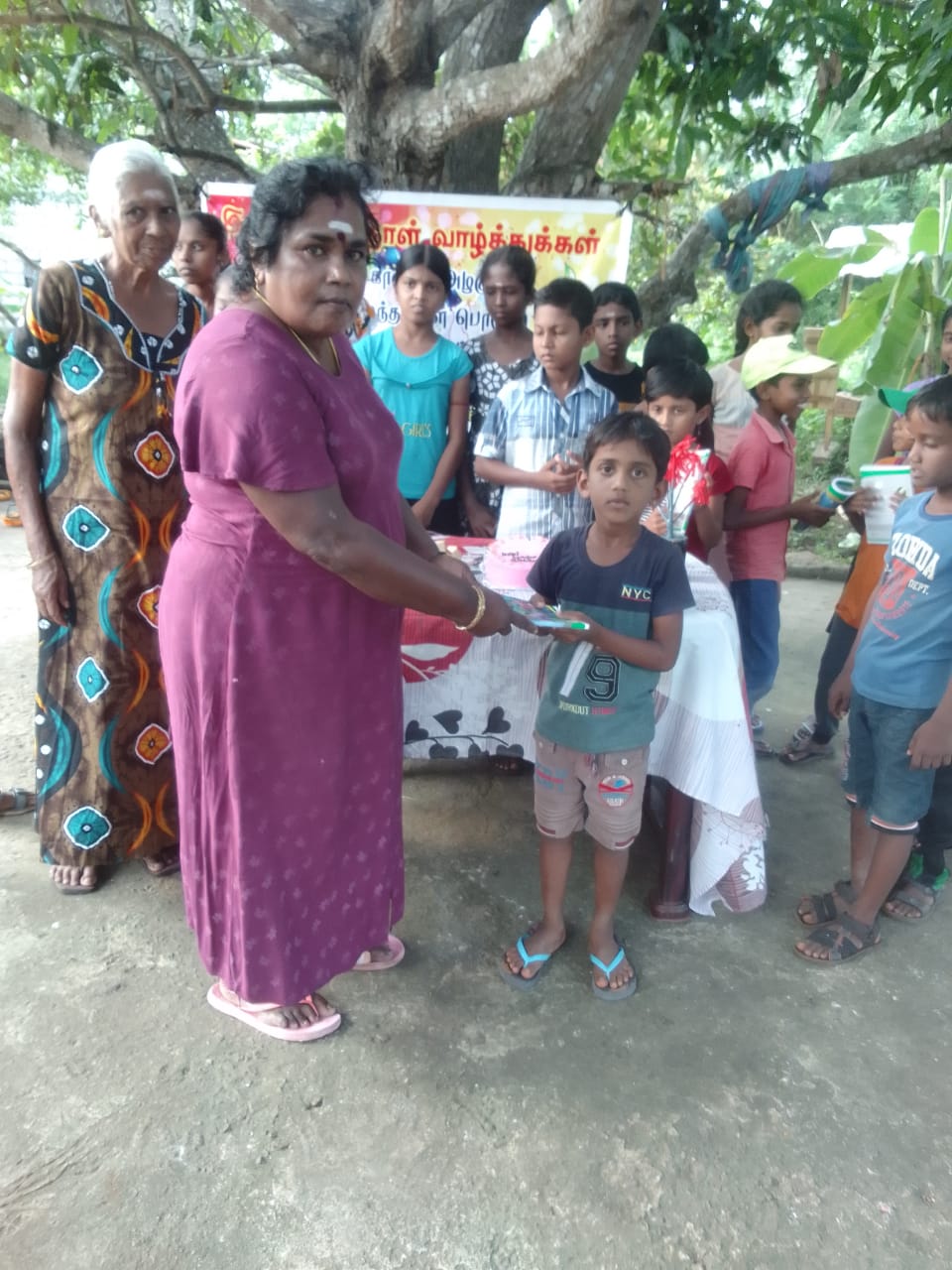இத்துடன் திரு.திருமதி பாபு மீரா தம்பதிகள் தங்கள் ஏகபுதல்வனான கோபியின் பிறந்த நாளை முன்னிட்டு அக்கிராமத்தில் உள்ள மாலைநேர வகுப்புக்கு செல்லும் மாணவ மாணவிகளுக்கு கற்றலுக்கான அப்பியாசக் கொப்பிகள் வழங்கி வைத்தனர்.