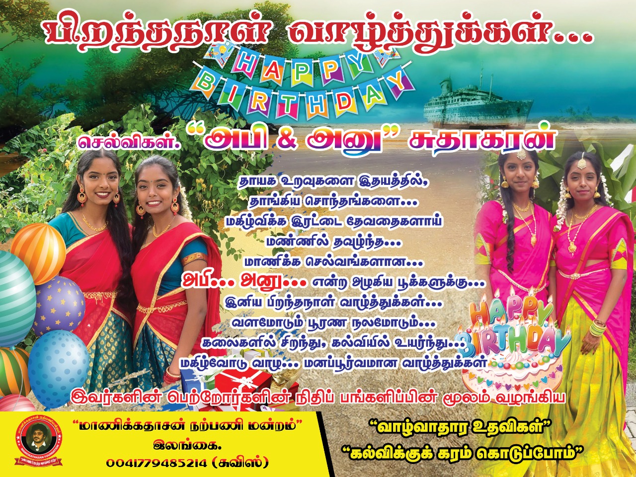 இவ்வாறு பல்வேறு வகைகளில் திரு. திருமதி சுதாகரன் செல்வி தம்பதிகள் தாயக உறவுகளுக்கு உதவி செய்ய வேண்டும் என்பதற்காகவே பல்வேறு வகைகளில், இவ்வாறான பணிகளை செய்து வருகின்றார்கள். அந்தவகையில் இன்றைய நாளில் பிறந்தநாள் கொண்டாடும் அவர்களின் இரட்டைச் செல்வங்களான அபி அனு ஆகியோரை, அவரது அம்மா, அப்பா, அண்ணன் ஆதி மற்றும் அவர்களின் உறவுகள் ஆகியோருடன், தாயக உறவுகளும், “மாணிக்கதாசன் நற்பணி மன்றமும்” இணைந்து பல்கலையும் கற்று, அனைத்து செல்வங்களும் பெற்று பல்லாண்டு காலம் நீடூழி வாழ்க வாழ்கவென இனிய பிறந்தநாள் வாழ்த்துக்களை தெரிவித்துக் கொள்கிறது.