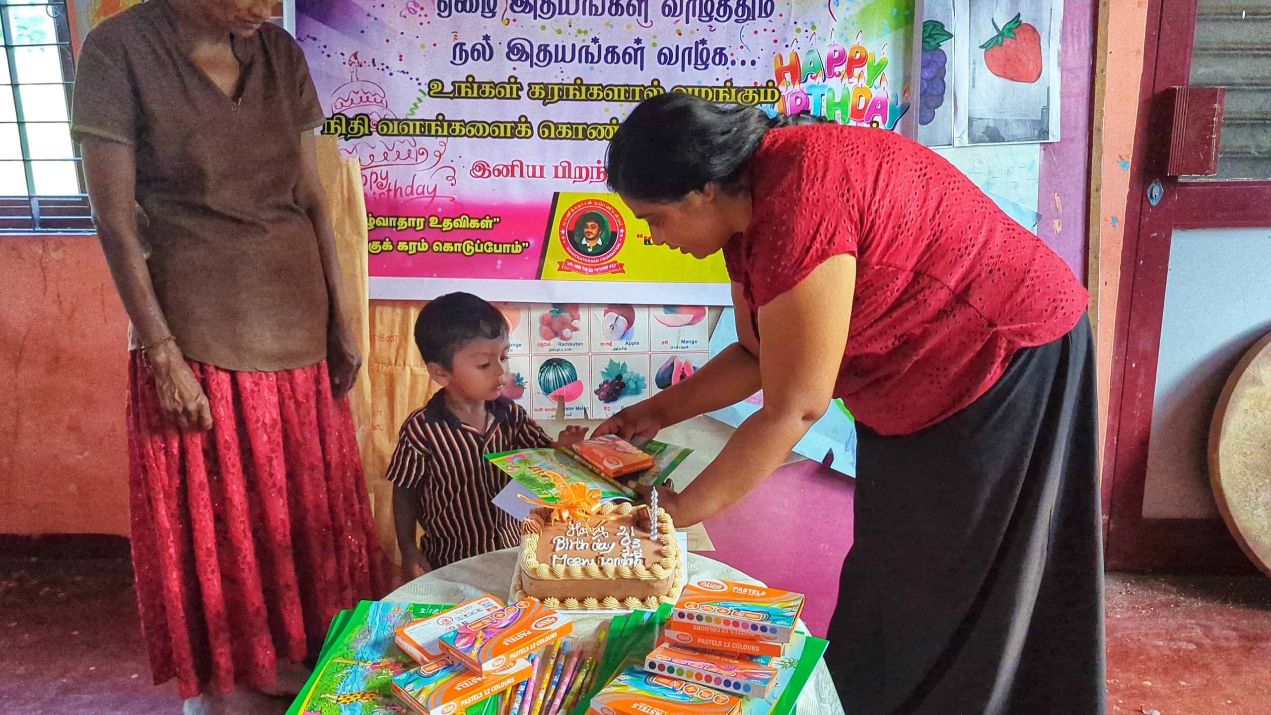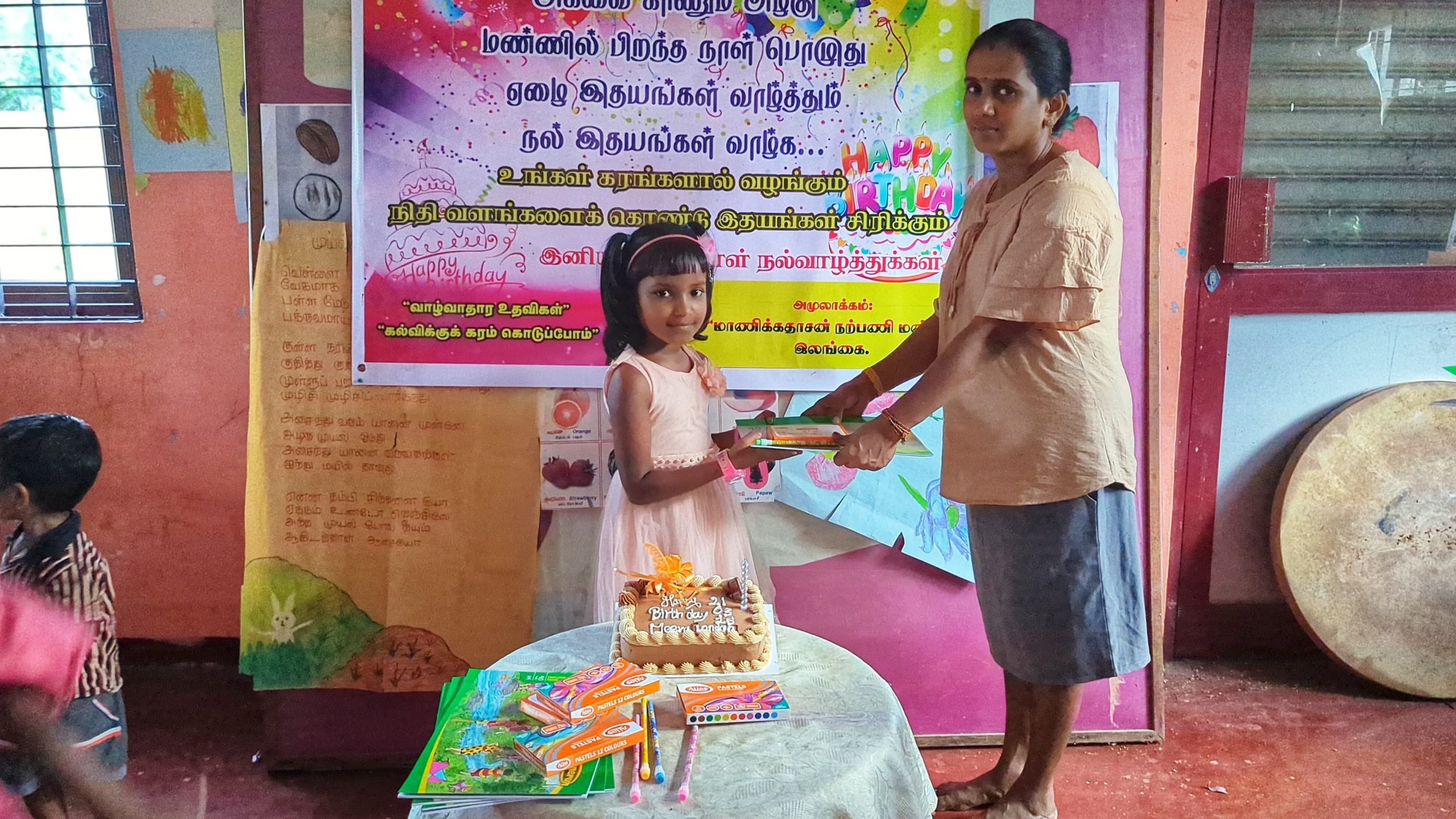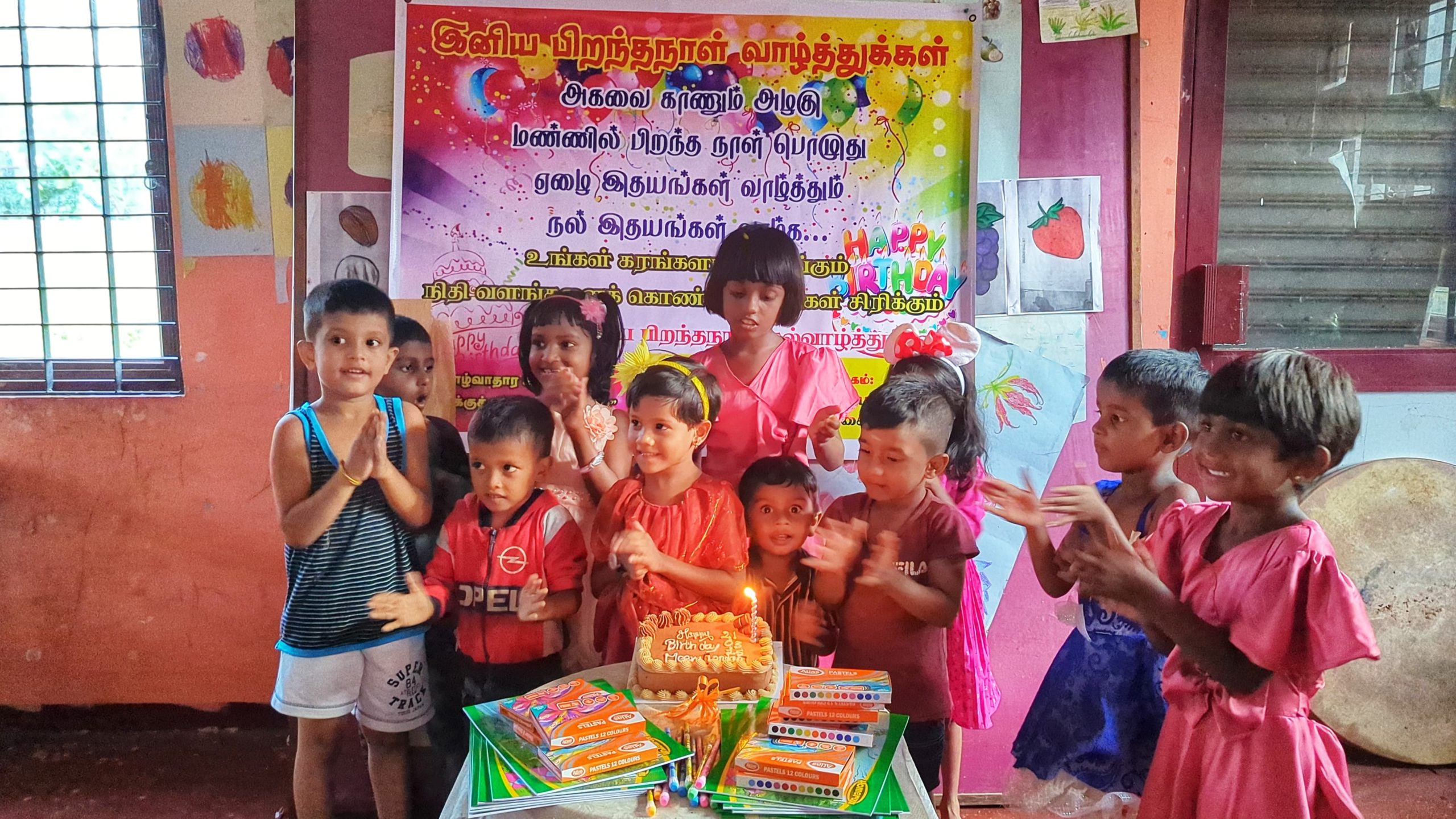 முதல் நிகழ்வாக மாணவ சிறார்களும், பெற்றோர்கள் கலந்து கொண்டு லண்டனில் வசிக்கும் மீரா அவர்களின் சார்பாக கேக் வெட்டி பிறந்த நாள் பாட்டுப்பாடி மகிழ்ச்சியாக கொண்டாடப்பட்டது.