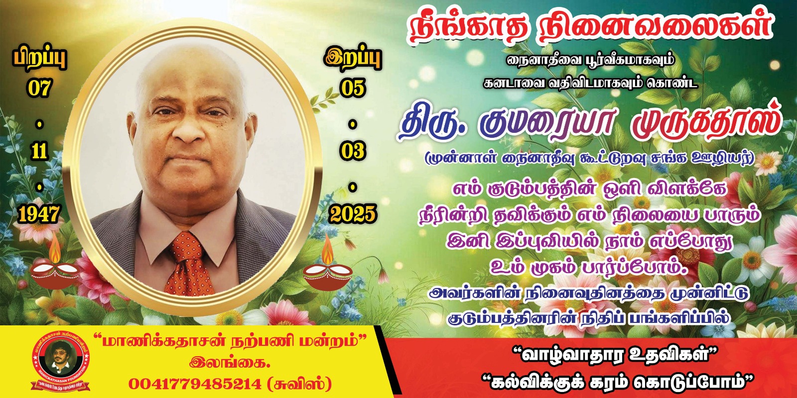 நைனாதீவை சேர்ந்தவரும் கனடாவில் அமரத்துவமடைந்தவருமான அமரர் குமரையா முருகதாஸ்