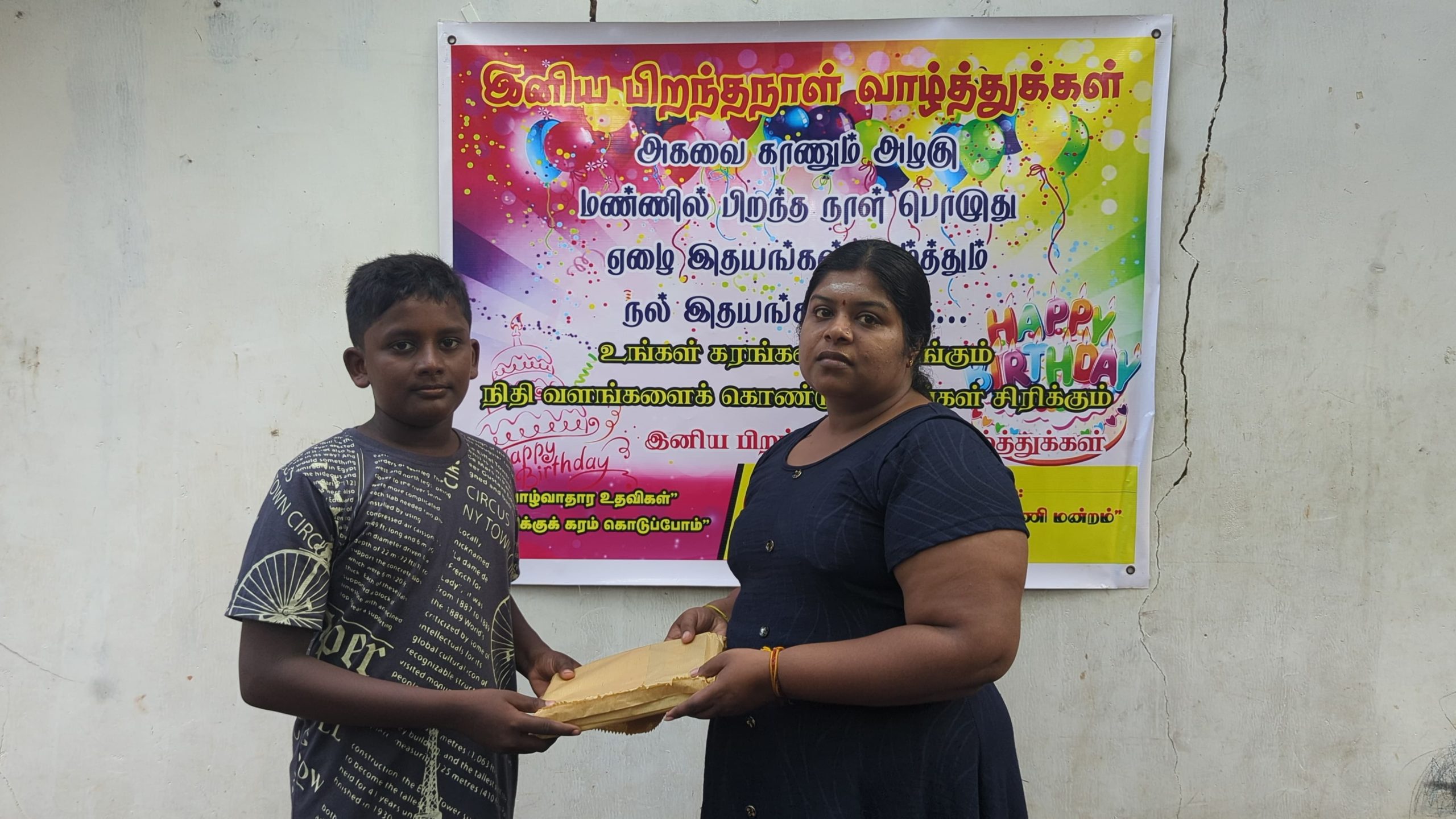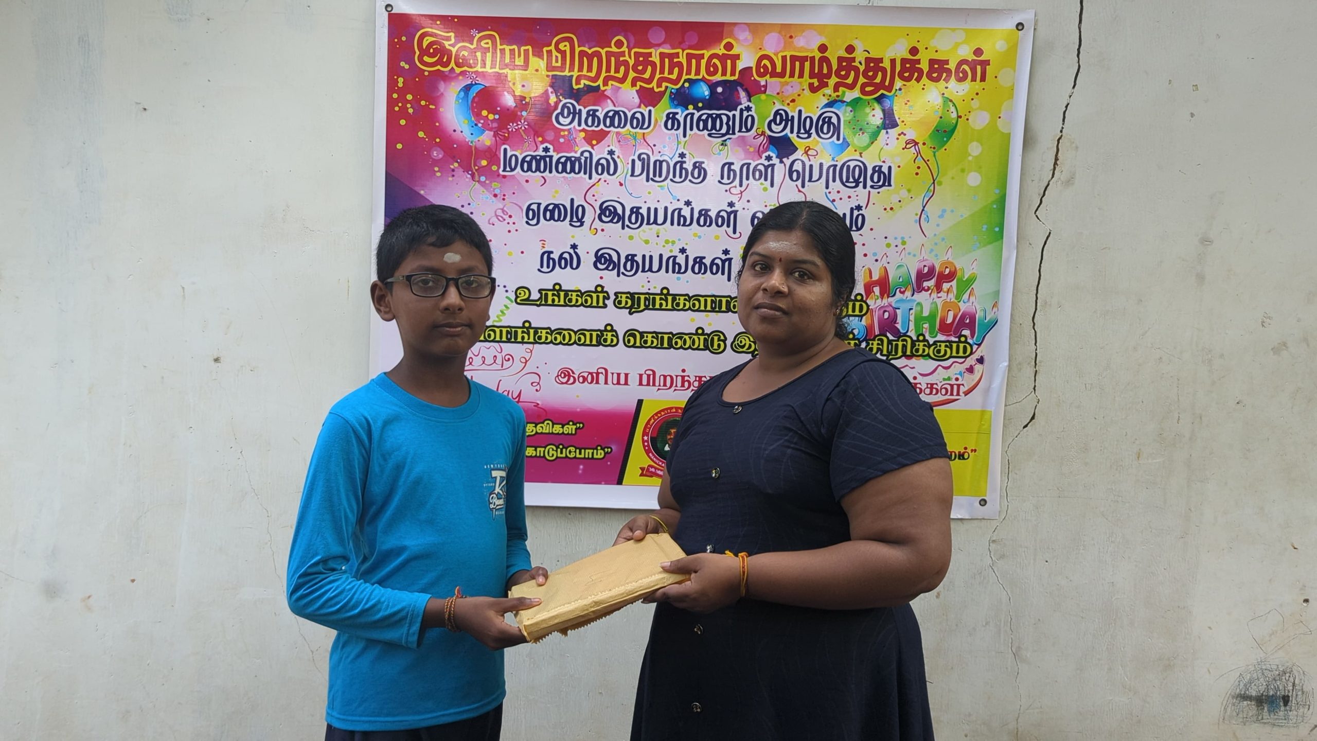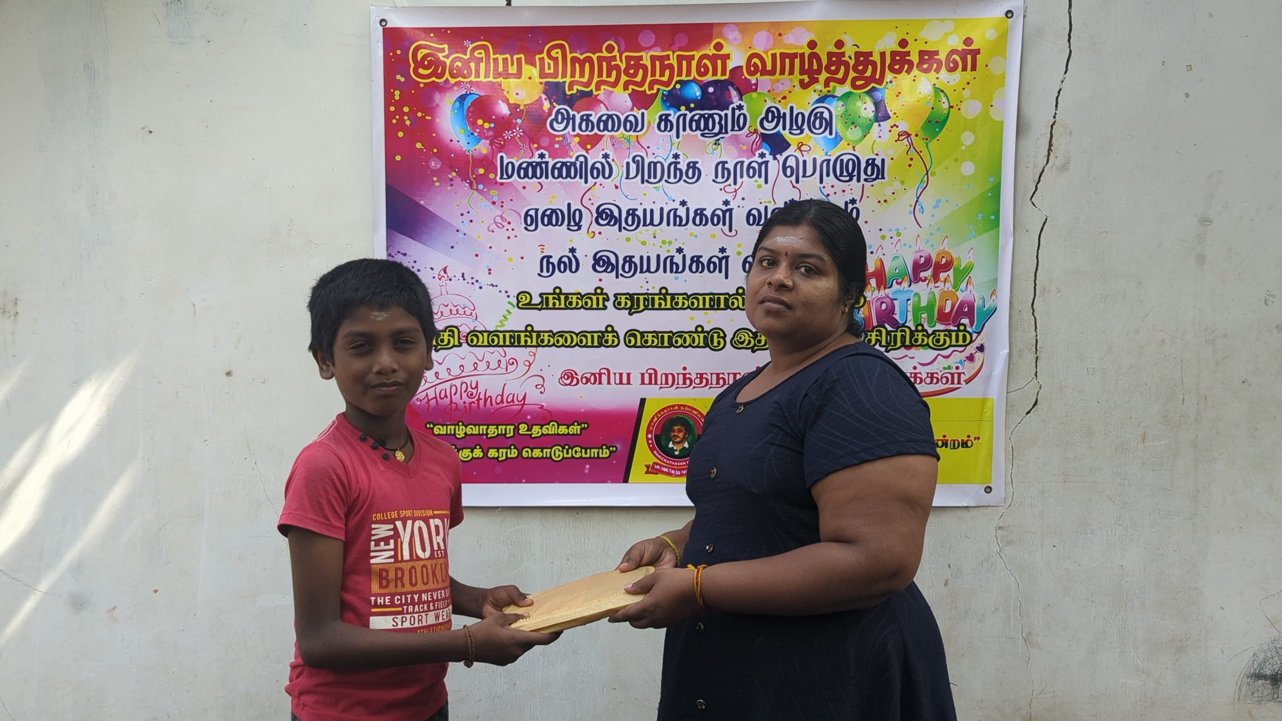 இத்துடன் திரு.திருமதி பாபு மீரா தம்பதிகள் தங்கள் ஏகபுதல்வனான கோபியின் பிறந்த நாளை முன்னிட்டு அக்கிராமத்தில் உள்ள மாலைநேர வகுப்புக்கு செல்லும் மாணவ மாணவிகளுக்கு கற்றலுக்கான அப்பியாசக் கொப்பிகள் வழங்கி வைத்தனர்.