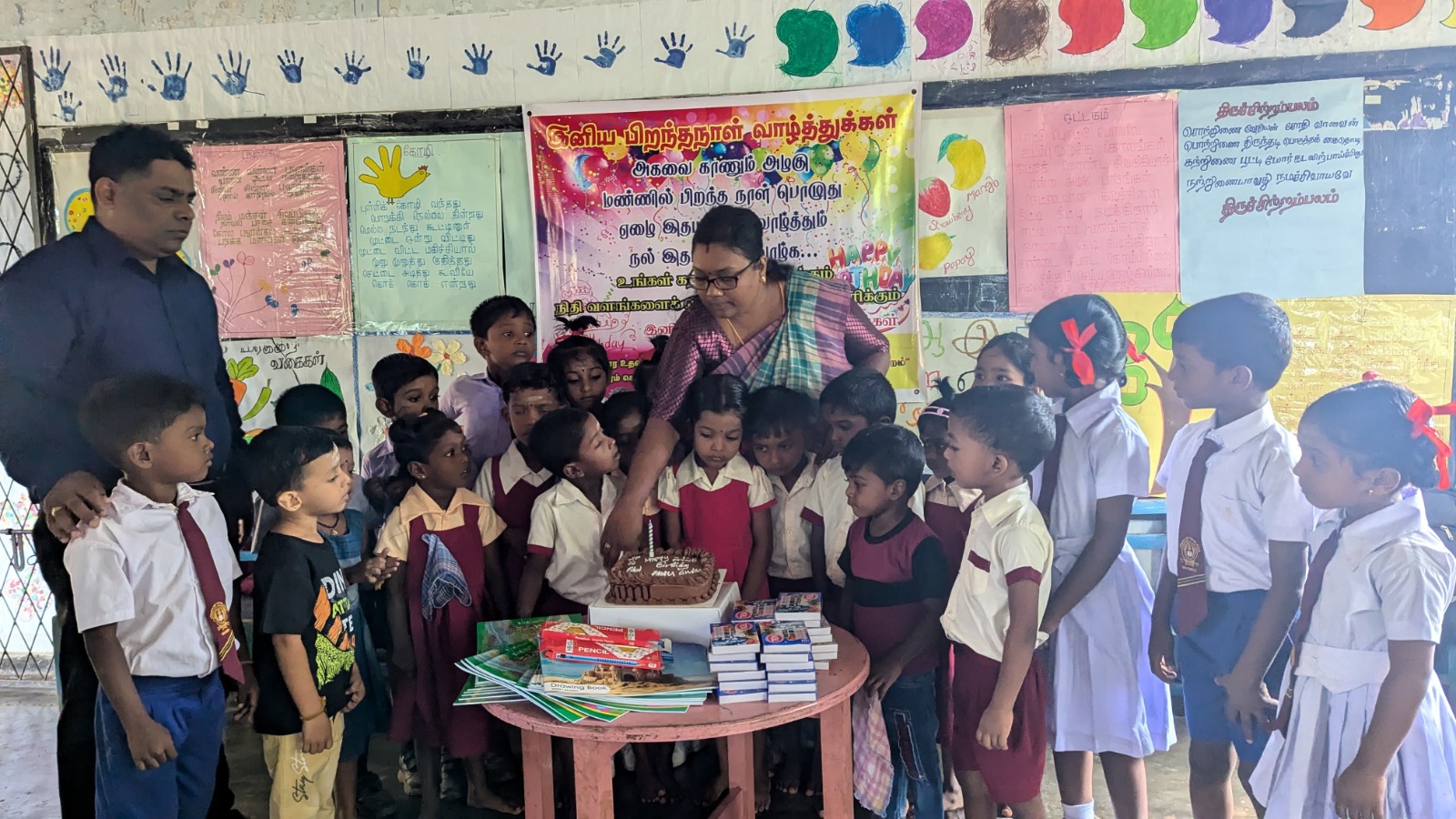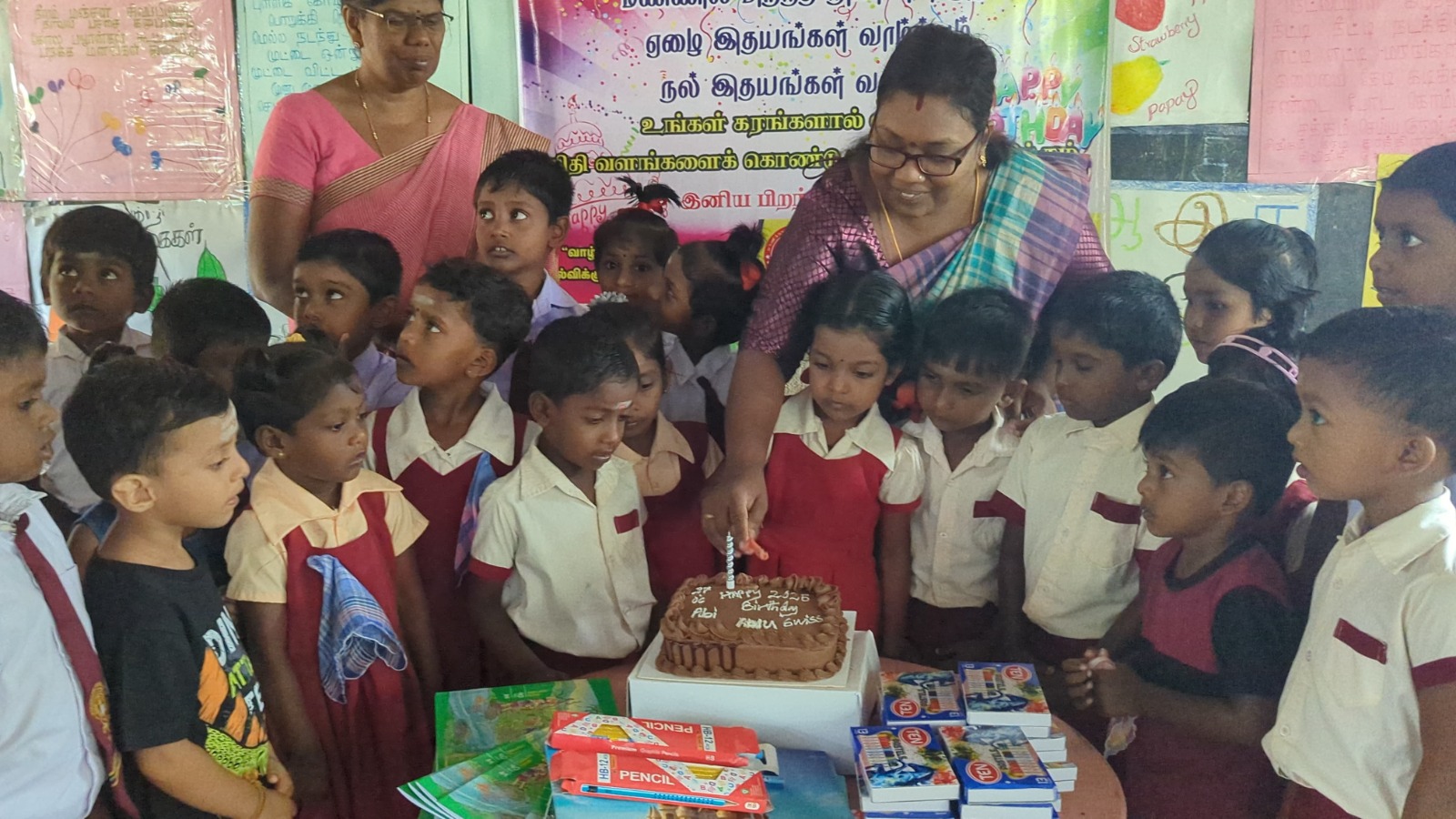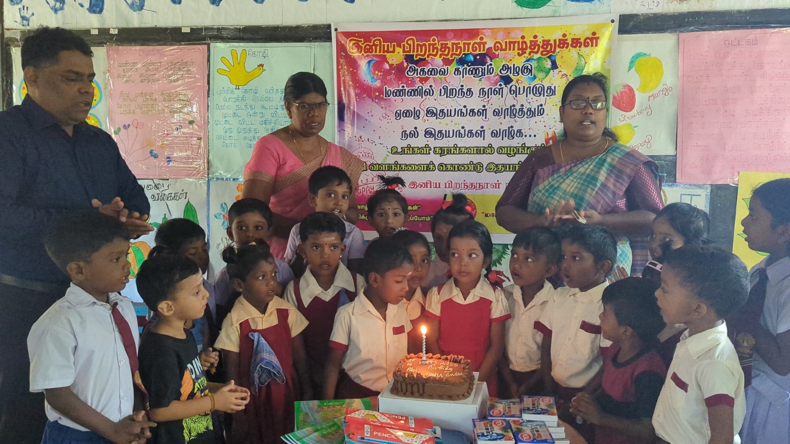 முதல் நிகழ்வாக மாணவ சிறார்களும், பெற்றோர்கள் கலந்து கொண்டு சுவிசில் வசிக்கும் அபி மற்றும் அணு அவர்களின் சார்பாக கேக் வெட்டி பிறந்த நாள் பாட்டுப்பாடி மகிழ்ச்சியாக கொண்டாடப்பட்டது.