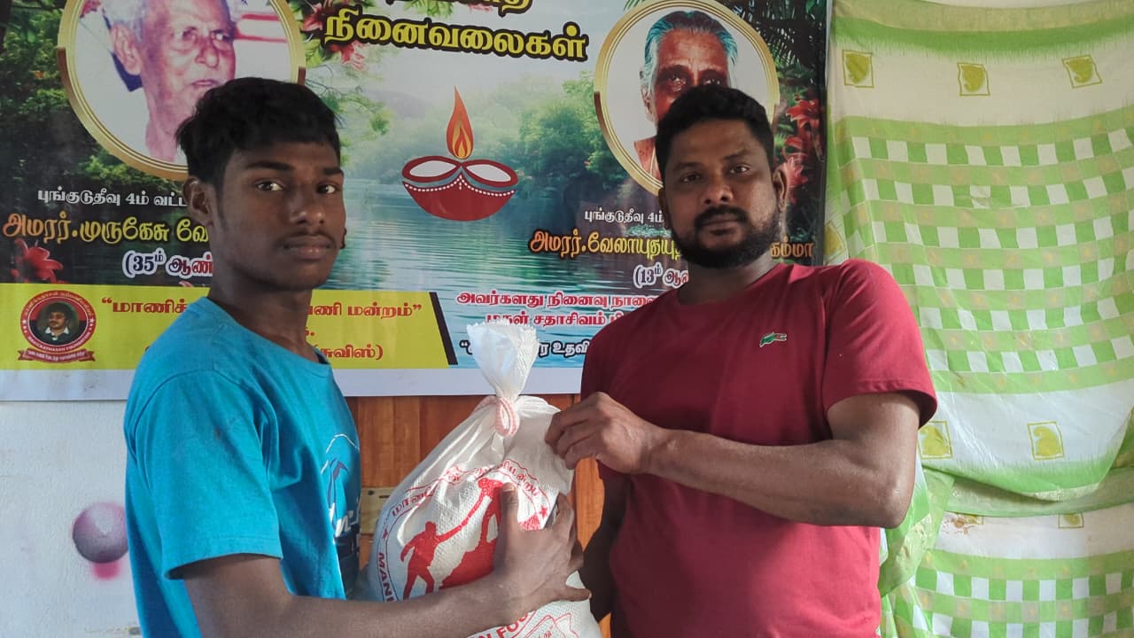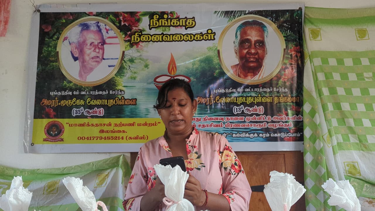 நினைவுநாளை முன்னிட்டும் மக்கள், மருமக்கள், பேரப்பிள்ளைகள் மற்றும் உற்றார், உறவினர்கள் சார்பாக அன்னாரின் மகளும் பிரான்ஸ் நாட்டில் வாழ்பவருமான திருமதி.சதாசிவம் பிரணவசொரூபி அவர்களின் நிதிப் பங்களிப்பில் வழங்கப்பட்டது.