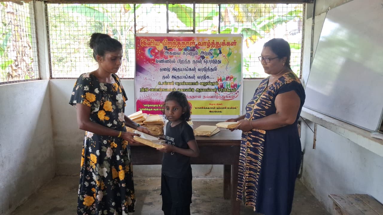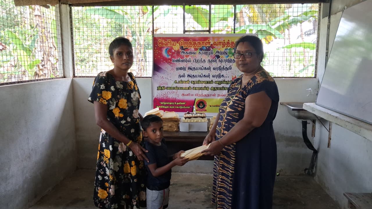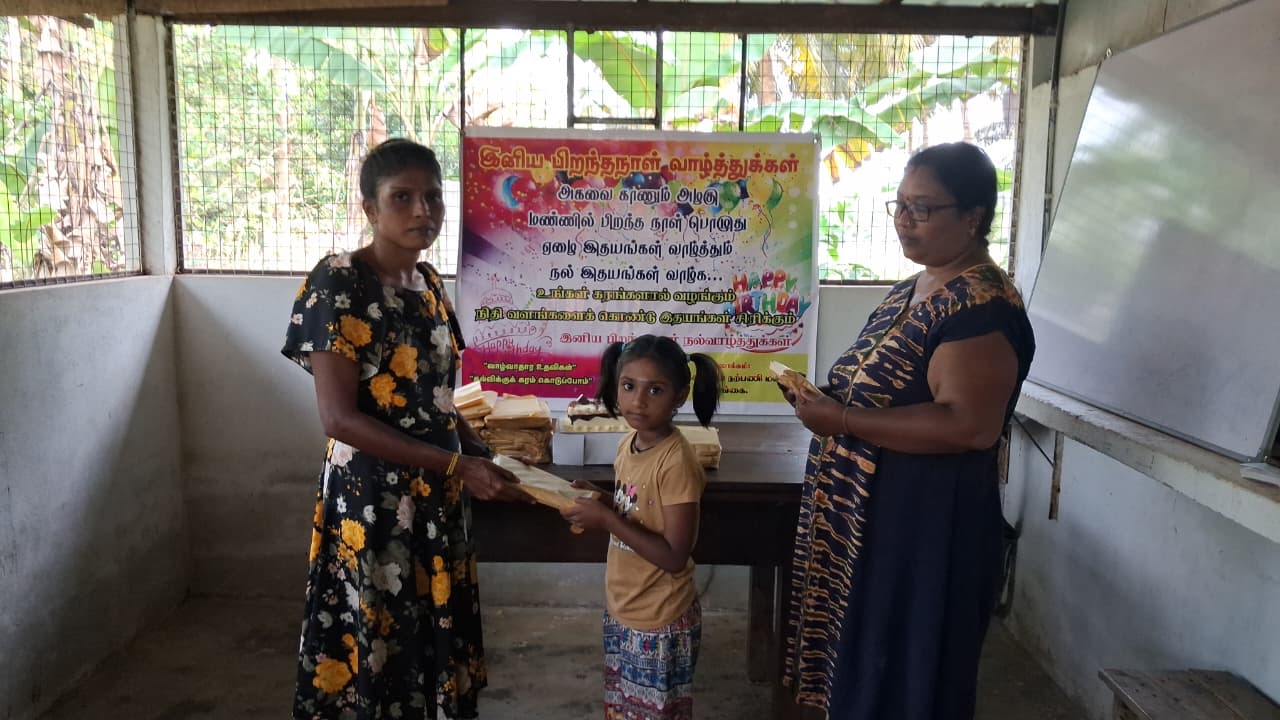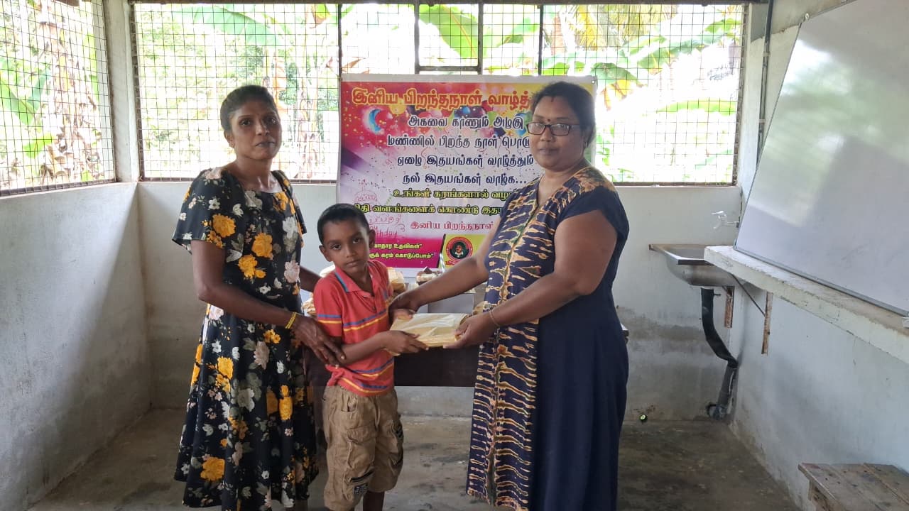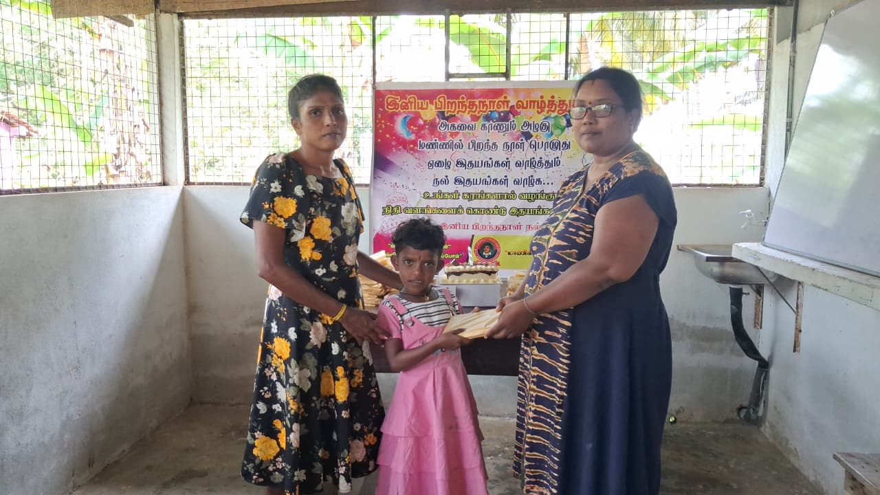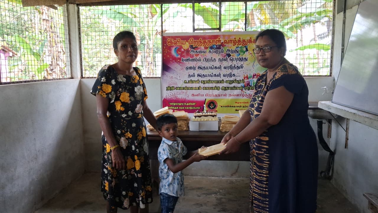 முதல் நிகழ்வாக மாணவ சிறார்களும், பெற்றோர்கள் கலந்து கொண்டு பிரான்சில் வசிக்கும் மேகலா அவர்களின் சார்பாக கேக் வெட்டி பிறந்த நாள் பாட்டுப்பாடி மகிழ்ச்சியாக கொண்டாடப்பட்டது.