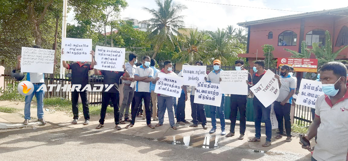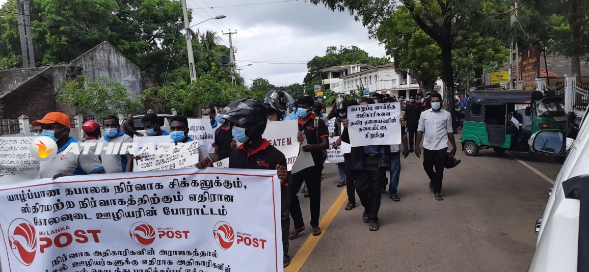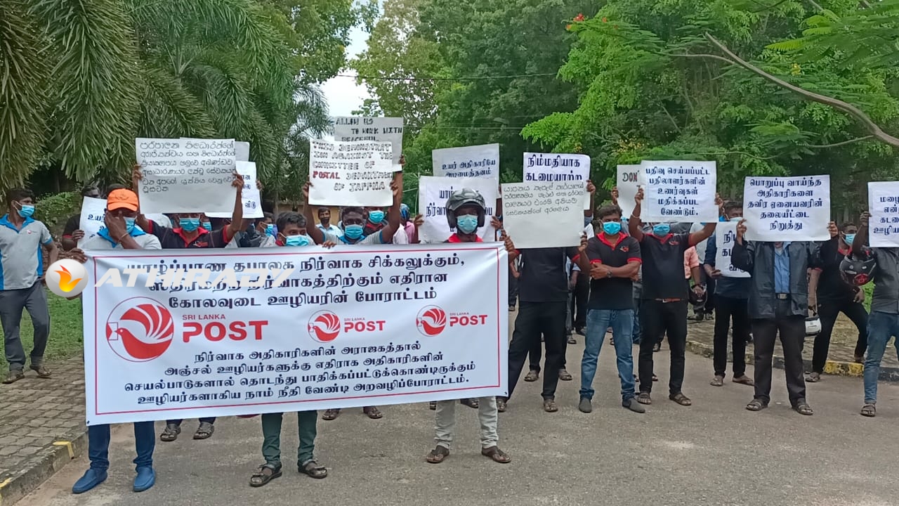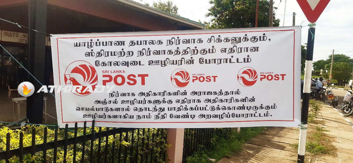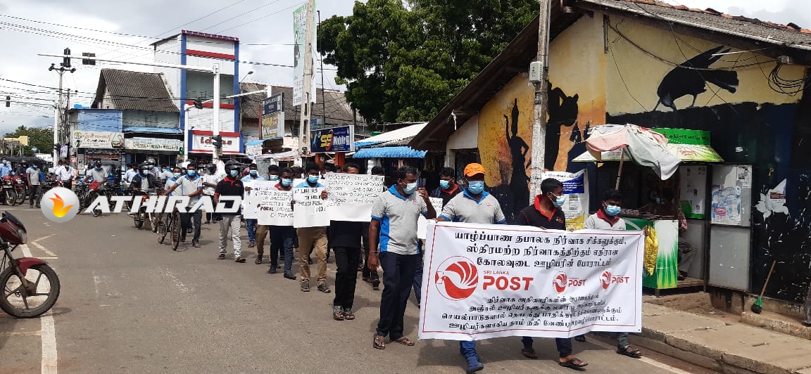 யாழ்ப்பாண பிரதம அஞ்சல் அலுவலகத்தில் கடமையாற்றும் ஊழியர்கள் பல்வேறுபட்ட இடர்களை ஊழியர்கள் எதிர்நோக்குவதாகவும் அஞ்சலகத்தின் நிர்வாகத்தினை உடனடியாக மாற்றுமாறு கோரி இன்றைய தினம் அதிகாலையிலிருந்து அஞ்சல் அலுவலகத்திற்கு முன்னால் கவனயீர்ப்பு போராட்டத்தில் ஈடுபட்டதோடு நடைபவனிஆக வடக்கு மாகாண ஆளுநர் செயலக முன்றலிலும் கவனயீர்ப்பு போராட்டத்தில் ஈடுபட்டனர்.