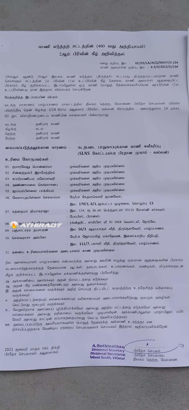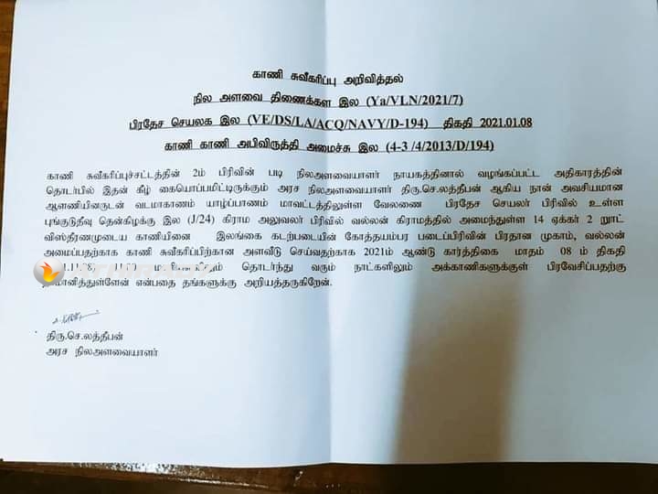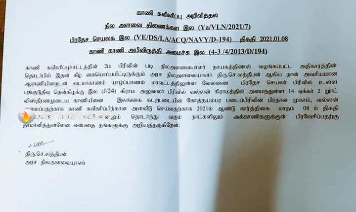 யாழ் புங்குடுதீவில் எதிர்வரும் திங்களன்று (08.11. 2021) புங்குடுதீவு வல்லன் பகுதியில் பொதுமக்களுக்கு சொந்தமான காணிகள் கடற்படையினரின் தேவைகளுக்காக சுவீகரிக்கப்படவுள்ளன .