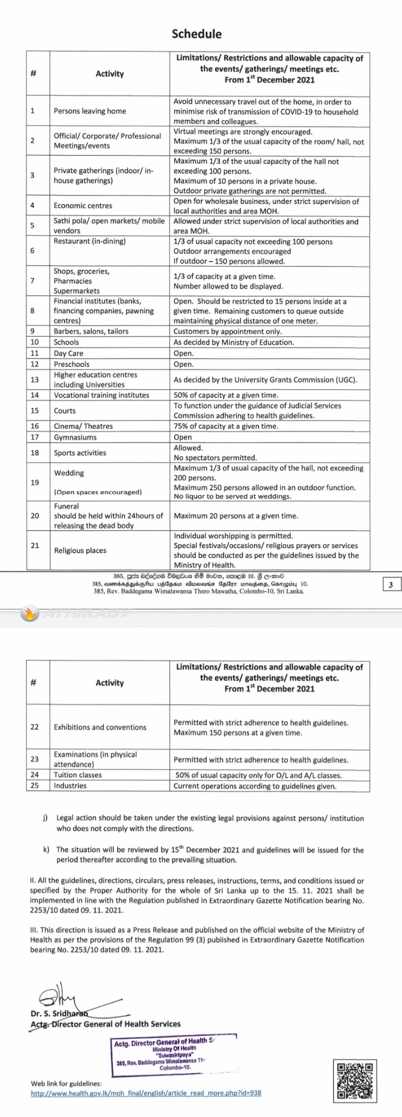 திருமண மண்டபங்களில் இருக்கைகளின் எண்ணிக்கையில் மூன்றில் ஒரு பங்கு இருக்கைகளுக்கே விருந்தினர்களையே அழைக்க முடியும் என்பதுடன் 200 விருந்தினர்களை விஞ்சக் கூடாது. திறந்த வெளி எனின், 250 பேர் அனுமதிக்கப்படுவர்.