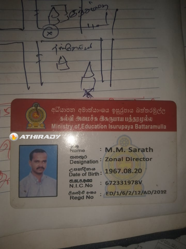 சந்தேக நபர் வைத்திருந்த அடையாள அட்டையில் கல்வி அமைச்சினால் வழங்கப்பட்டதாக குறிப்பிடப்பட்டுள்ளதுடன் கல்விப்பணிப்பாளர் என பதவி குறிப்பிடப்பட்டுள்ளது.