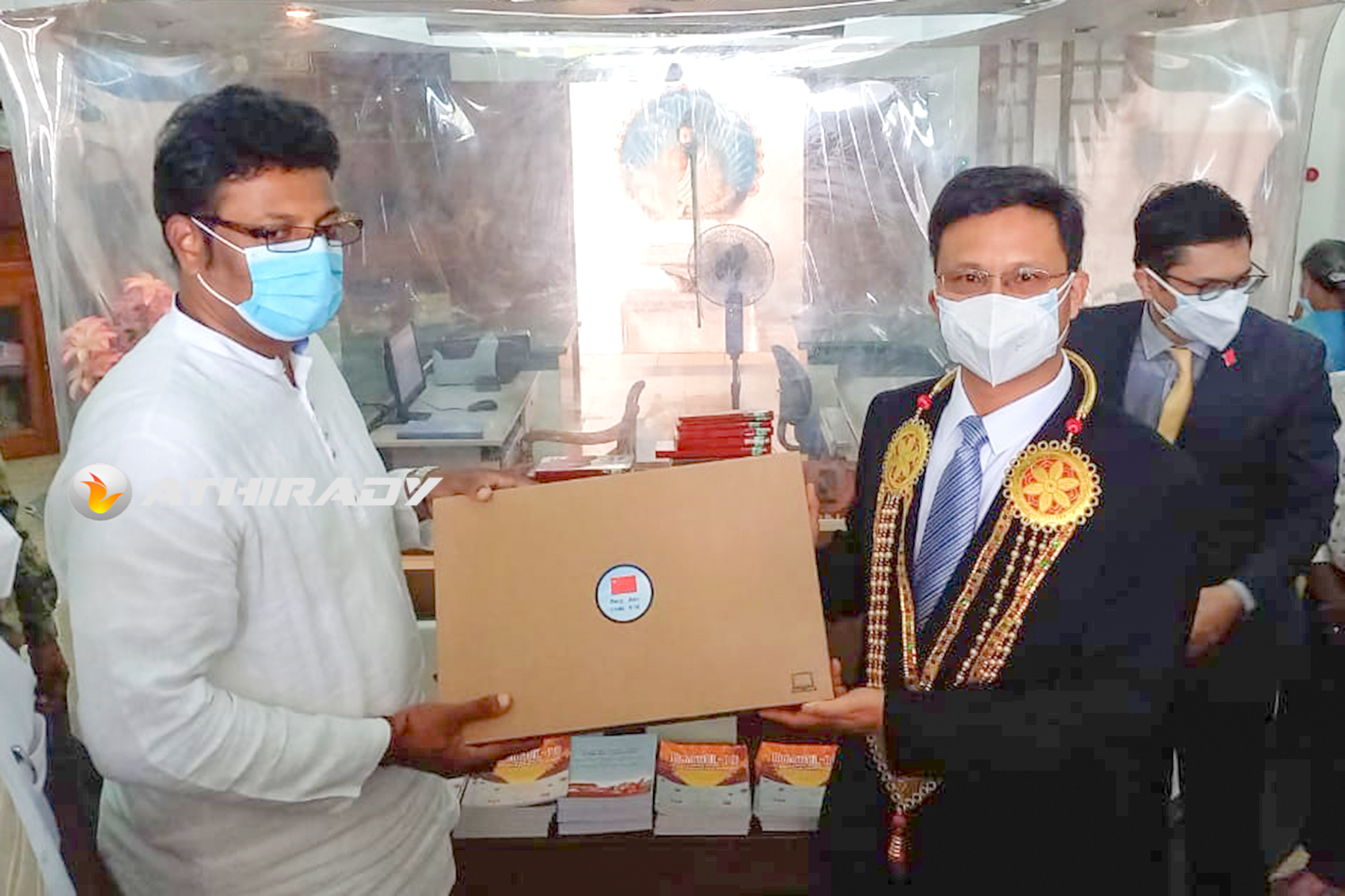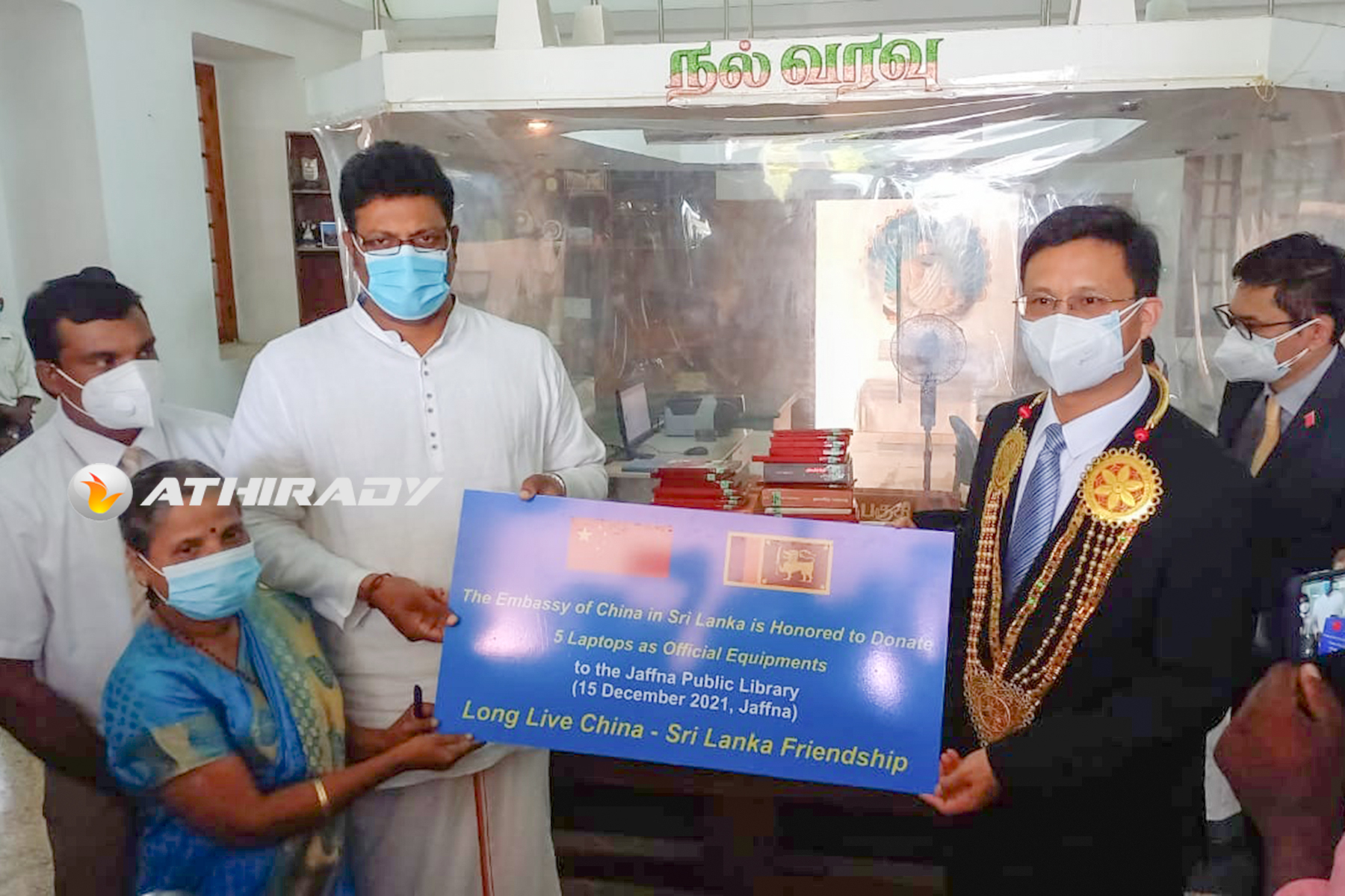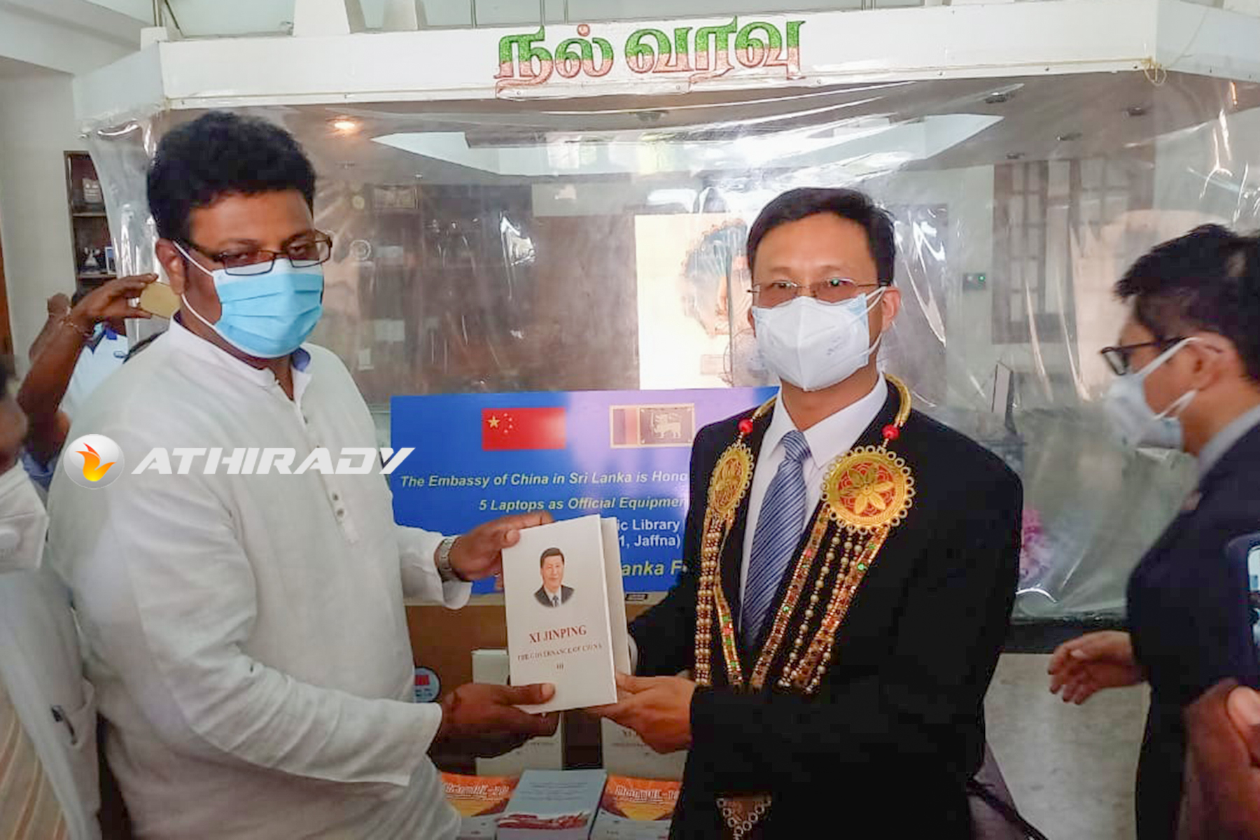 யாழ்ப்பாணம் பொது நூலகத்துக்கு மடிகணனி, நூல்களையும் சீனத் தூதுவர் வழங்கிவைத்தார்.