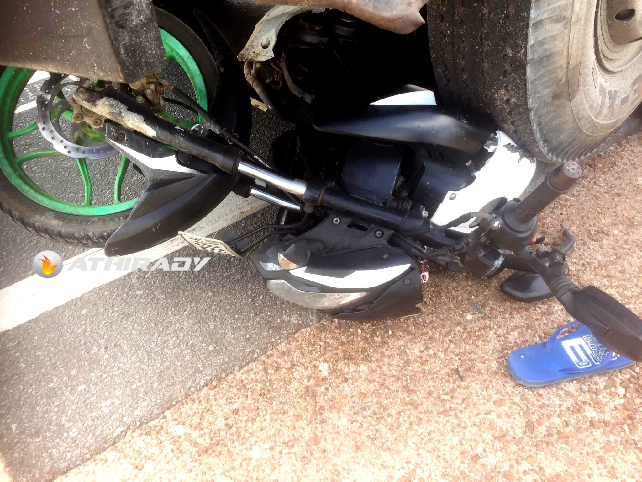 யாழ்.வளைவுக்கு அருகில் இன்றைய தினம் திங்கட்கிழமை இடம்பெற்ற டிப்பர் – மோட்டார் சைக்கிள் விபத்தில் மோட்டார் சைக்கிள் முற்றாக சேதமடைந்துள்ளது.