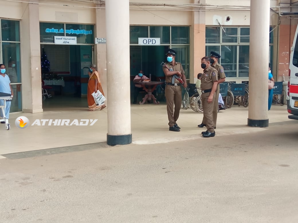 இந்நிலையிலே வைத்தியசாலை வளாகம் , ஏ9 வீதி , வைத்தியசாலை சுற்றுவட்ட வீதி , குருமன்காடு போன்ற பகுதிகளில் பொலிஸார் கடமையில் ஈடுபடுத்தப்பட்டுள்ளனர்.