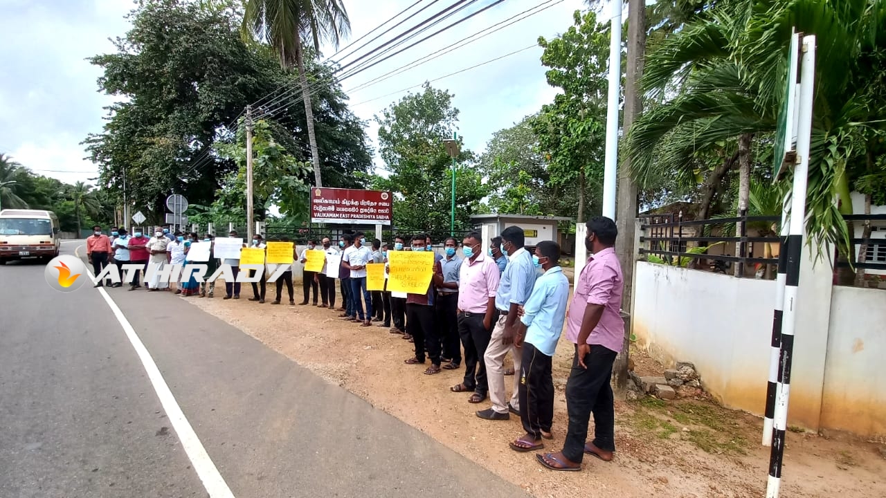 யாழ்ப்பாணம் – வலிகாமம் கிழக்கு பிரதேச சபை முன்றலில் பிரதேச சபை செயலாளரை அச்சுறுத்தியவரை கைது செய்ய கோரி கவனயீர்ப்பு போராட்டம் முன்னெடுக்கப்பட்டது.