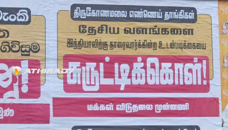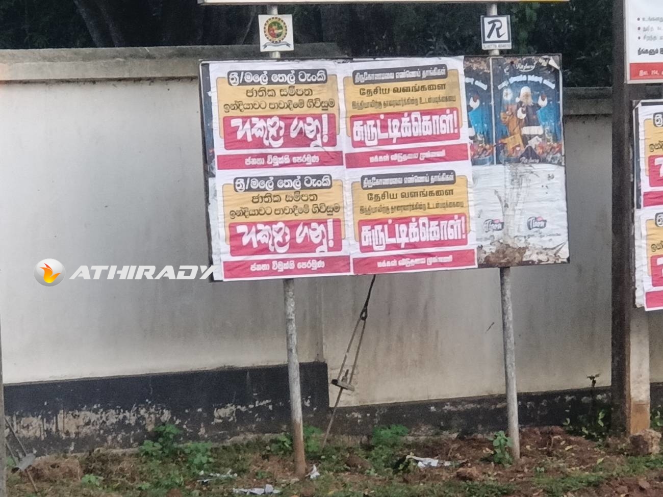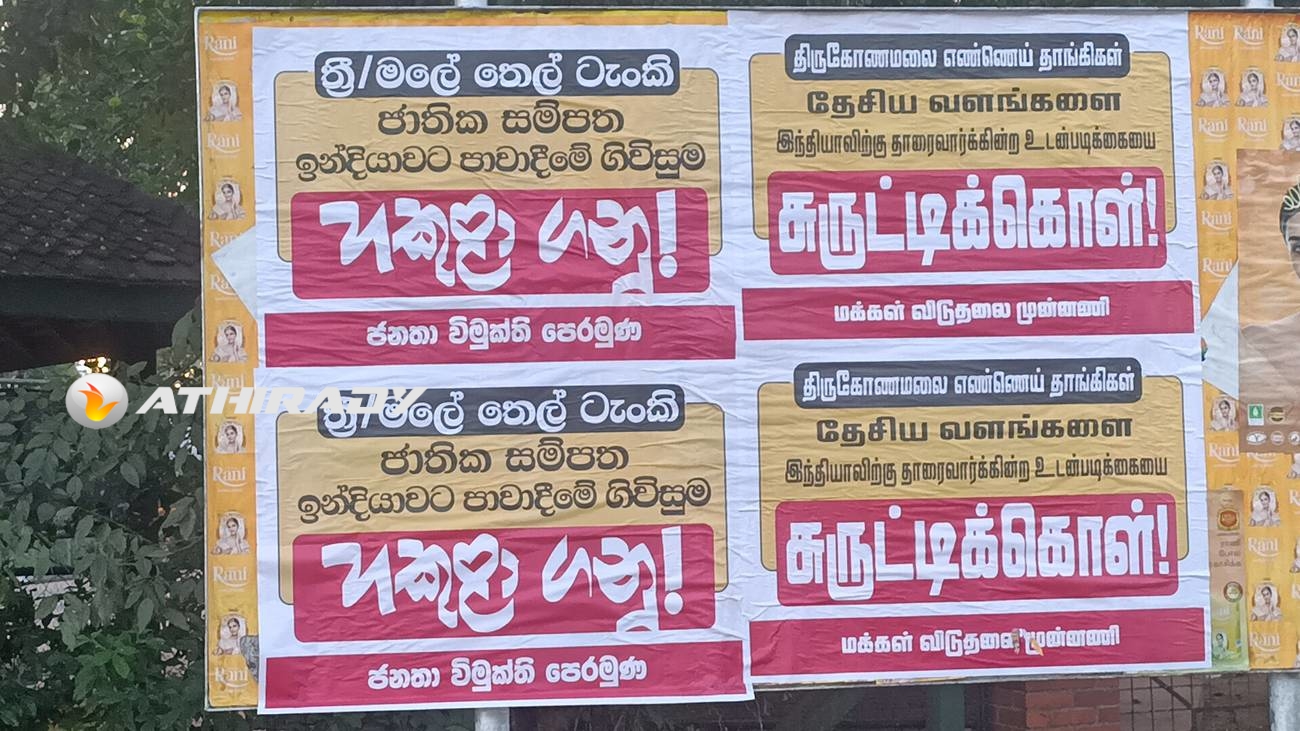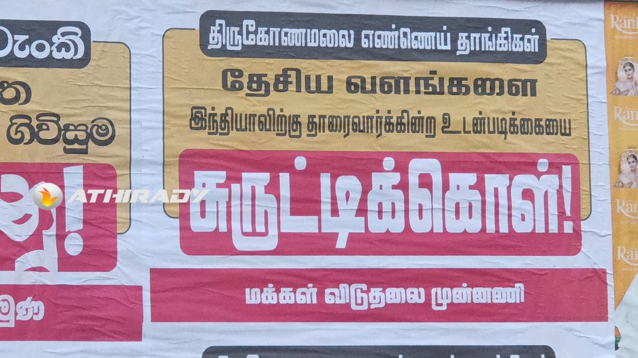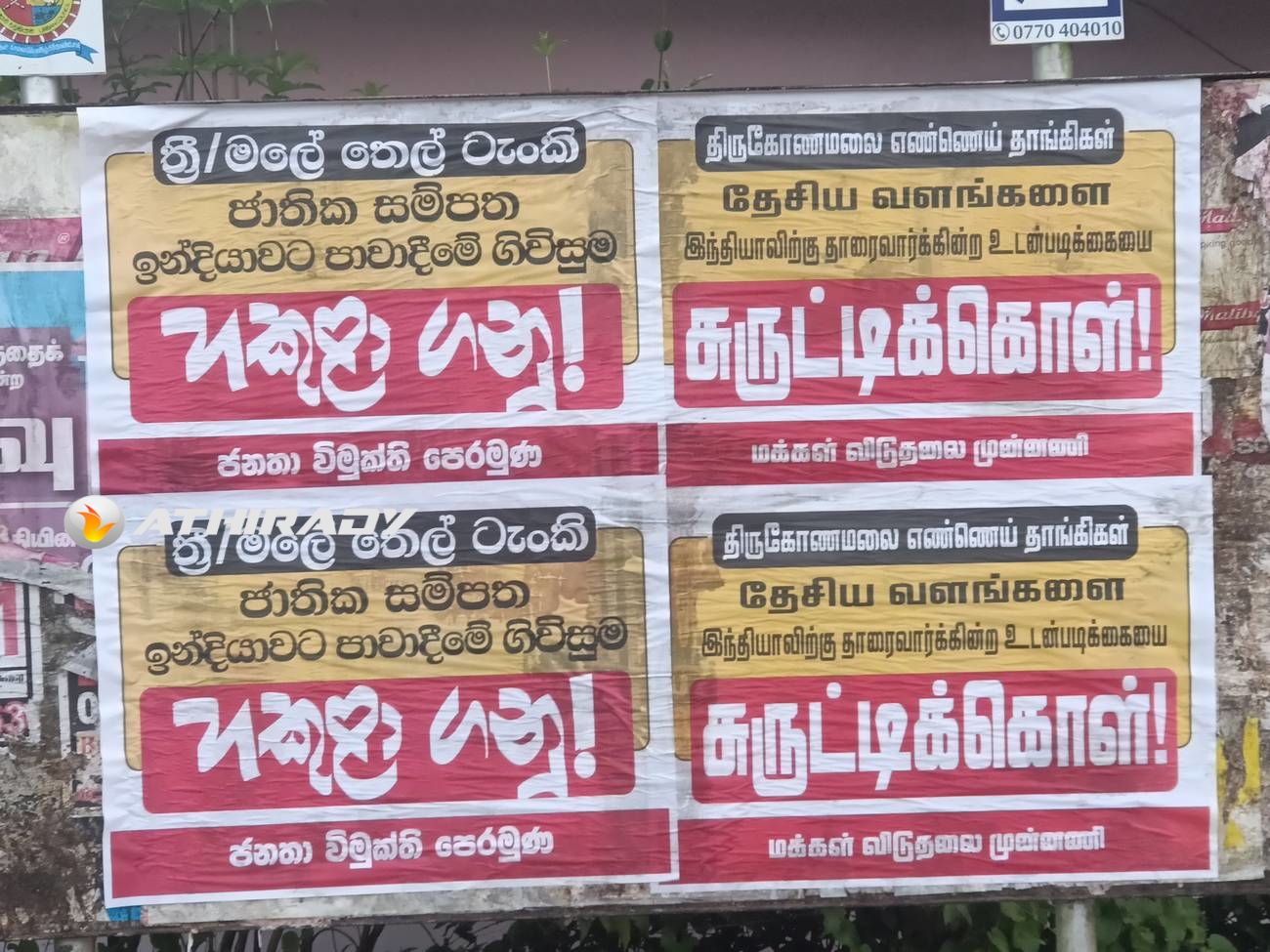 ”திருகோணமலை எண்ணெய் தாங்கிகள் தேசிய வளங்களை இந்தியாவிற்கு தாரைவார்க்கின்ற உடன்படிக்கையை சுருட்டிக்கொள்” என்ற வாசகத்தினை தாக்கிய சுவரோட்டிகள் வவுனியா நகரின் பல இடங்களில் பரவலாக ஒட்டப்பட்டுள்ளன