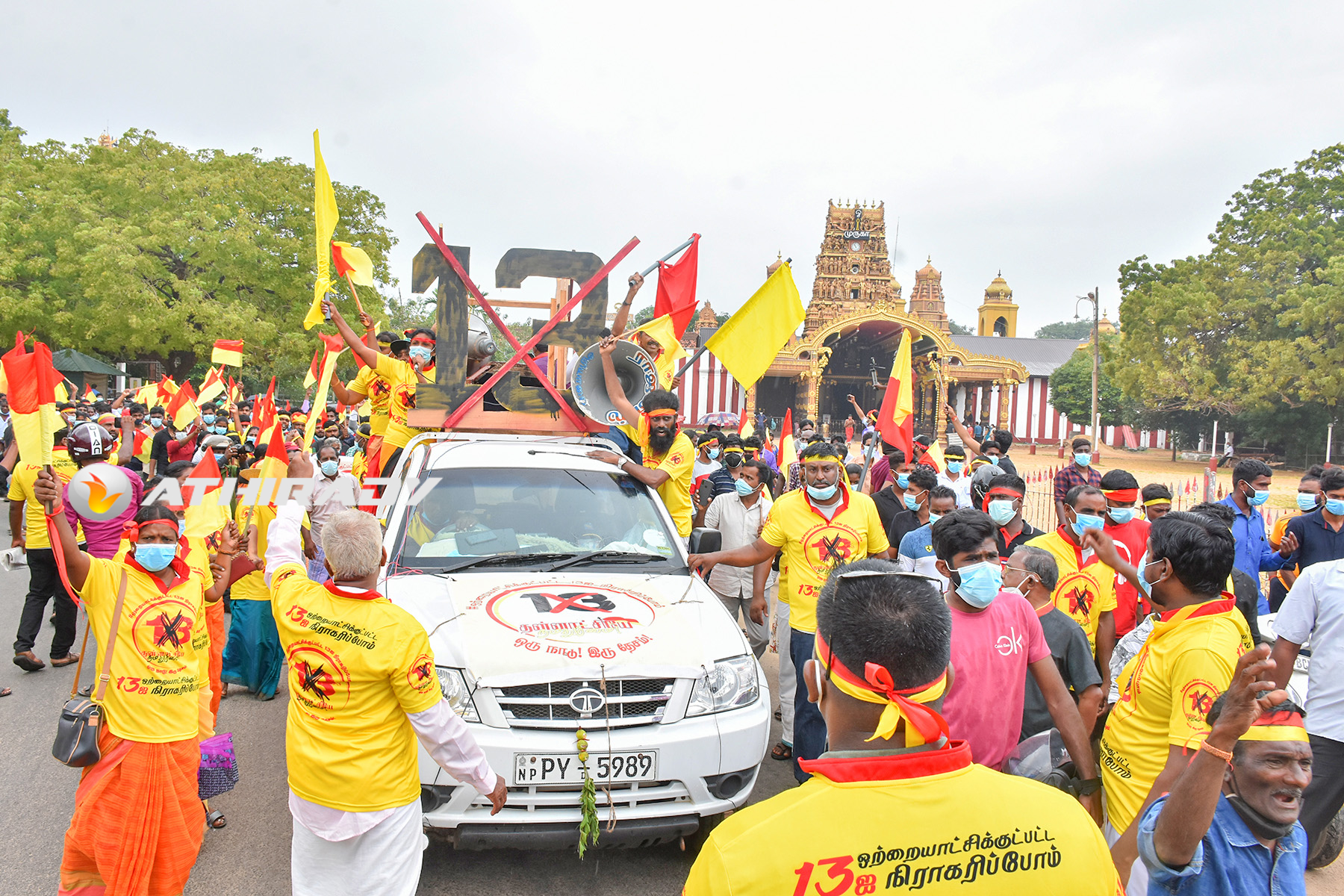 ஒற்றையாட்சிக்கு உட்பட்ட 13ஜ நிராகரிப்போம் எனும் தொனிப்பொருளில் முன்னெடுக்கப்பட்ட இந்த பேரணி நல்லூர் தியாகதீபம் திலீபனின் நினைவிடத்தில் இருந்து ஆரம்பமாகி பருத்தித்துறை வீதியின் ஊடாக கிட்டு பூங்காவை சென்றடைந்தது.