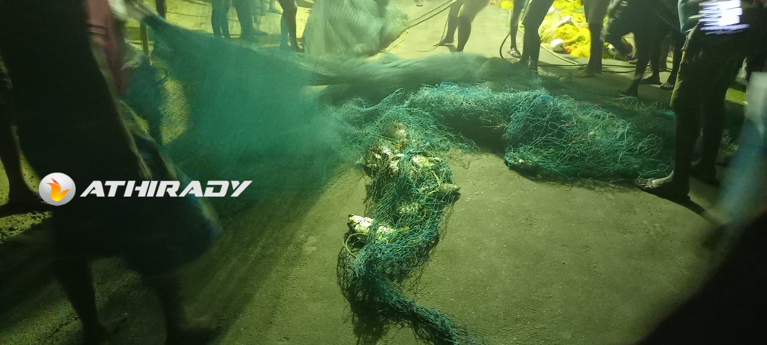 இந்திய இழுவைப் படகை தடுத்து நிறுத்திய உள்ளூர் மீனவர்கள் அந்தப் படகிலிருந்த வலைகள் மற்றும் மீன்களை கைப்பற்றினர்.