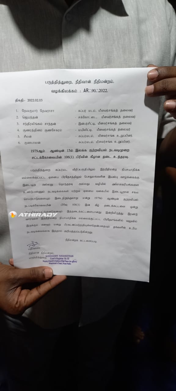 பருத்தித்துறை – சுப்பர்மடம் பகுதியில் மீனவர்கள் முன்னெடுத்துள் போராட்டத்திற்கு பருத்தித்துறை நீதவான் நீதிமன்றம் தடை விதித்துள்ள நிலையில் குறித்த தடை உத்தரவு கட்டளை பருத்தித்துறை பொலிஸாரினால் போராட்டம் இடம்பெறும் இடத்தில் வாசிக்கப்பட்டுள்ளது.