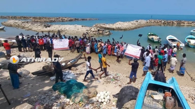 வீதியில் இறங்கி போராட்ட நீதிமன்றம் தடை – கடலில் இறங்கி போராடும் மீனவர்கள்! (படங்கள்)