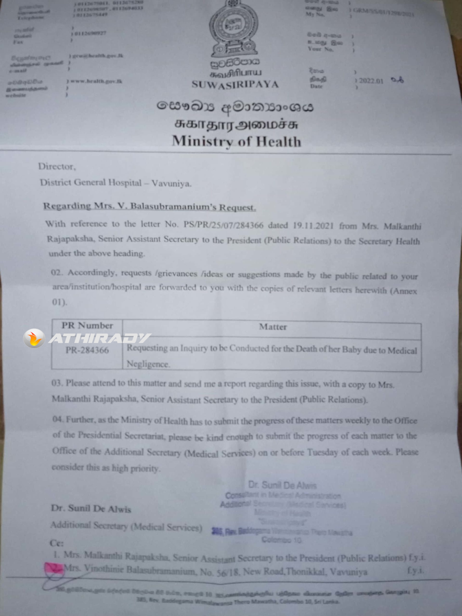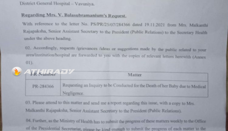 மருத்துவ அலட்சியத்தால் தனது குழந்தை இறந்தது என கிடைத்த முறைப்பாடு குறித்து விசாரணை நடத்துமாறு கோருவதுடன், இந்த விடயத்தில் கவனம் செலுத்தி பிரச்சனை தொடர்பான அறிக்கையை திருமதி மல்காந்தி ராஜபக்ஷவிற்கு பிரதியுடன் எனக்கு அனுப்பவும்.