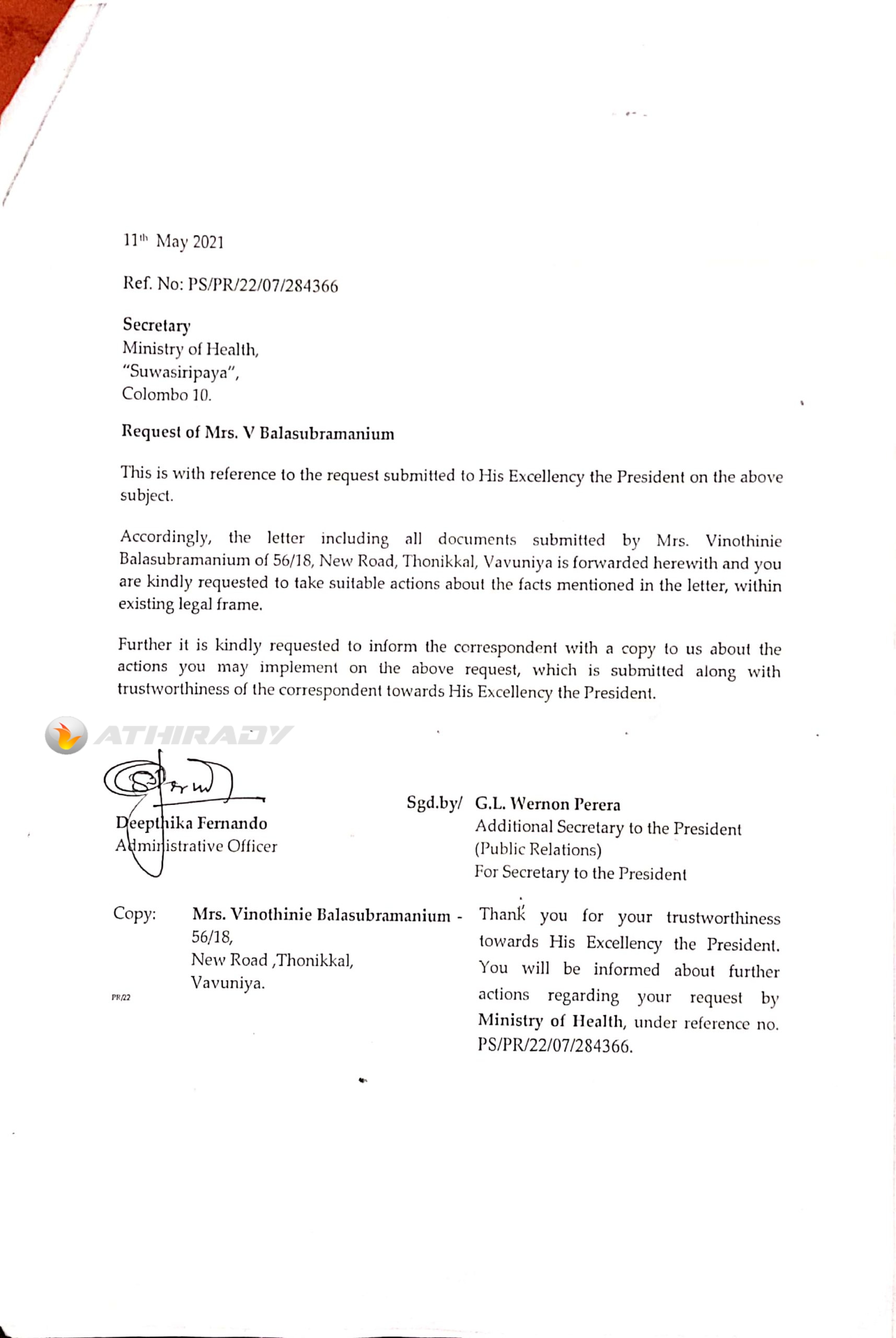 குறித்த முறைப்பாடுகள் தொடர்பில் கவனம் செலுத்திய ஜனாதிபதி செயலகத்தின் மூத்த உதவிச் செயலாளர் (பொது செய்திகள்) திருமதி.மல்காந்தி ராஜபக்ஷவிடமிருந்து சுகாதார அமைச்சுக்கு விளக்கம் கோரியும், விசாரணை அறிக்கை கோரியும் கடிதம் அனுபப்பட்டுள்ளது. இதனையடுத்து சுகாதார அமைச்சினால் வவுனியா வைத்தியசாலை பணிப்பாளரிடம் விளக்கம் கோரப்பட்டு கடிதம் அனுப்பப்பட்டுள்ளது. சுகாதார அமைச்சின் மருத்துச சேவைகள் மேலதிக செயலாளர் வைத்தியர் சுனில் டி அல்விஸ் அவர்களால் அனுப்பி வைக்கப்பட்டுள்ள குறித்த கடிதத்தில் தெரிவிக்கப்பட்டுள்ளதாவது,