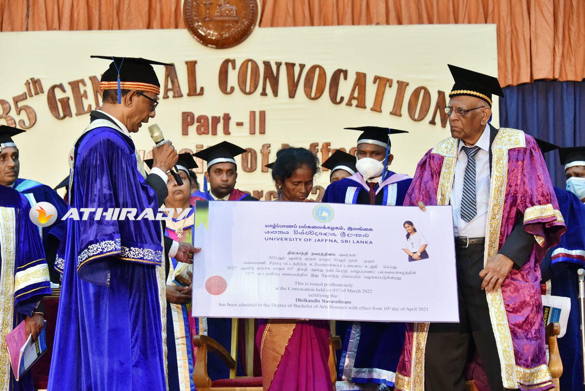 யாழ். பல்கலைக்கழக கலைப்பீடத்தின் ஊடகத் துறையில் சிறப்புக் கலைமாணி பட்டம் பெற்ற செல்வி தில்காந்தி நவரட்ணம் பட்டமளிப்பு விழாவின் போது உயிருடன் இல்லாத நிலையில் அவருக்கான சிறப்புப் பட்டம் அவரது தயாரிடம் வழங்கப்பட்டது.