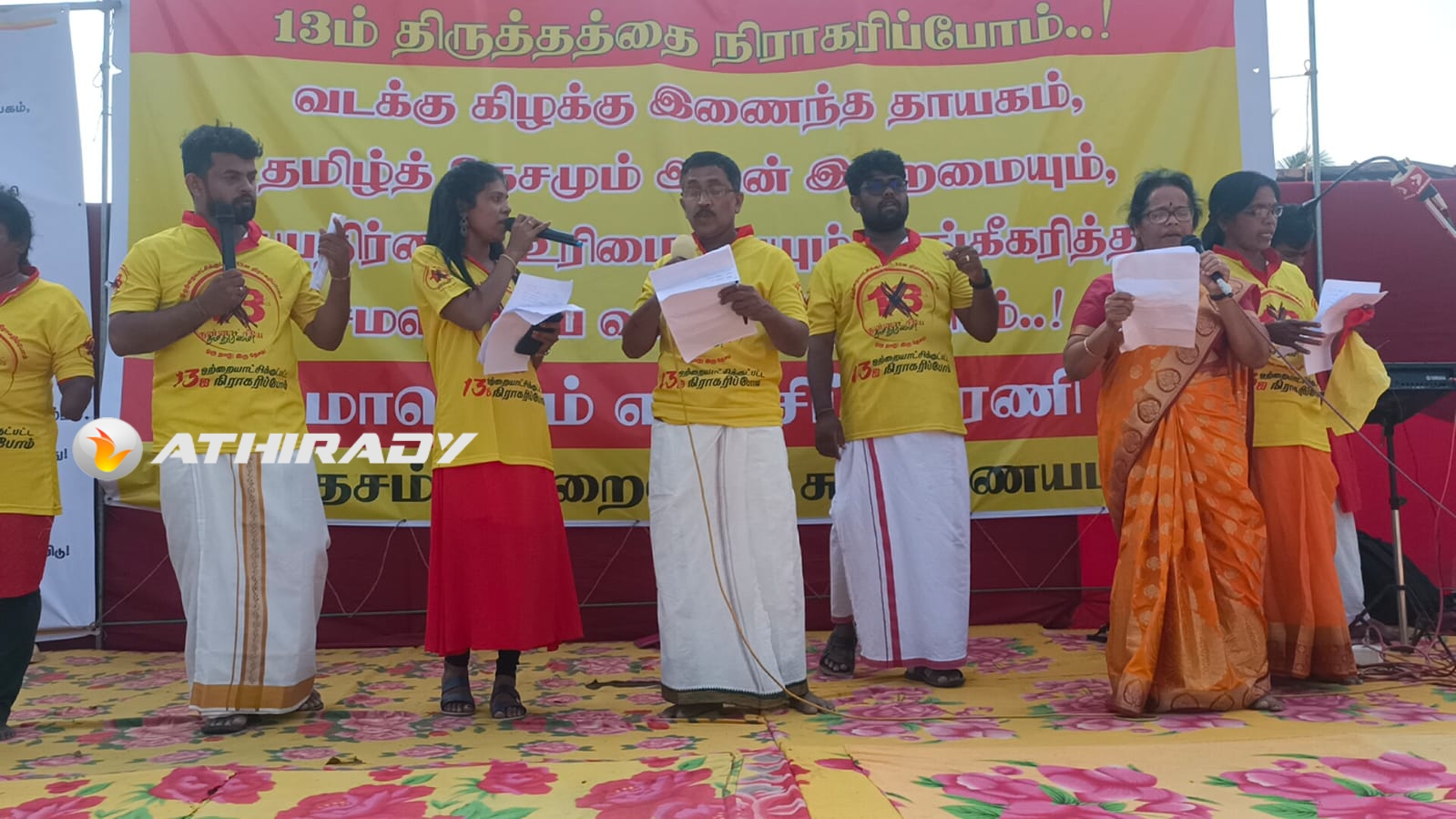 சிவப்பு, மஞ்சள் கொடிகளுடன் பேரணியில் கலந்து கொண்ட மக்கள் ‘ஒற்றையாட்சிக்குட்பட்ட 13ம் திருத்த சட்டத்தினை நீக்கி சமஸ்டி தீர்வினை நடைமுறைப்படுத்து, சர்வதேச விசாரணை வேண்டும், இனப்படுகொலைக்கு நீதி வேண்டும், இந்த மண் எங்களில் சொந்த மண், இராணுவமே வெளியேறு, பயங்கரவாத தடைச்சட்டத்தினை நீக்கு’ உள்ளிட்ட பல்வேறு கோசங்களை எழுப்பியவாறு ஆயிரக்கணக்கான மக்கள் இந்தப் பேரணியில் கலந்து கொண்டிருந்தனர்.