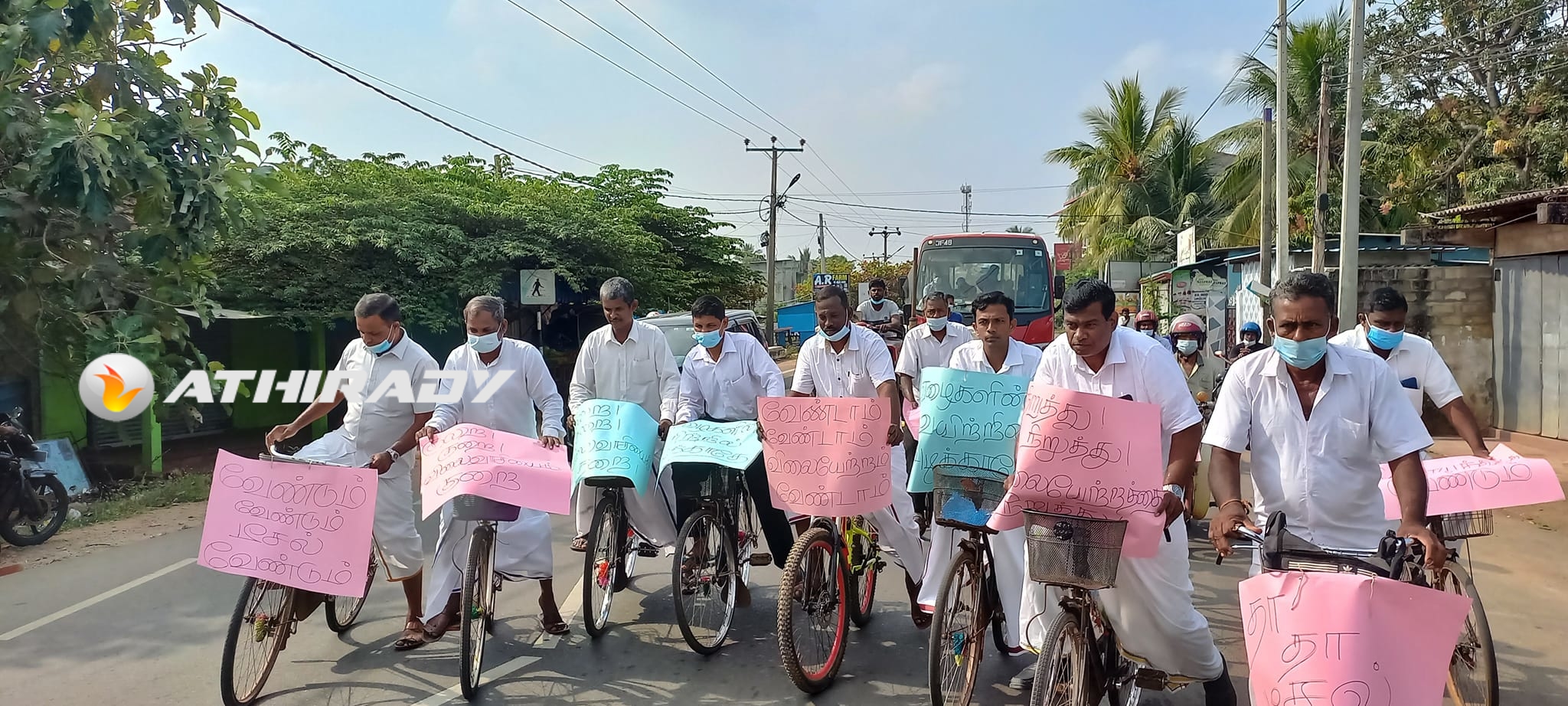 அத்தியாவசிய பொருட்கள் மற்றும் எரிபொருள் விலை யேற்றத்திற்கு எதிர்ப்பு தெரிவிக்கும் முகமாக யாழ்ப்பாணம் வலிகாமம் வடக்கு பிரதேச சபை உறுப்பினர்கள் மல்லாகத்திலிருந்து வலி வடக்கு பிரதேச சபை வரை சைக்கிள் பேரணியாகச் சென்று தமது எதிர்ப்பை வெளியிட்டுள்ளனர்