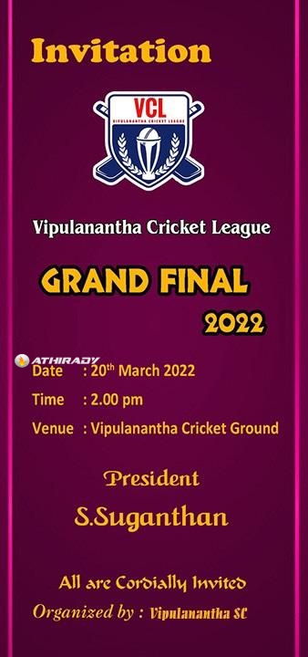 மேலும், இறுதிப்போட்டியை நேரலையாக https://www.facebook.com/vipulananthaofficial/ எனும் முகநூல் ஊடாக கண்டு களிக்க முடியும்.