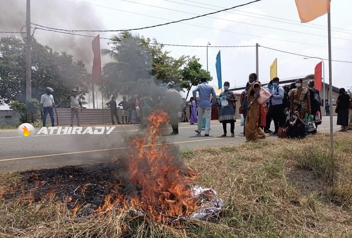 இதேவேளை, பிரதமரை வரவேற்கும் முகமாக யாழில் கட்டப்பட்டிருந்த பதாதைகளை கிழித்து, தீயிட்டு எரித்து தமது எதிர்ப்பையும் ஆற்றாமையையும் காணாமல் ஆக்கப்பட்டவர்களின் உறவுகள் வெளிப்படுத்தினர்.