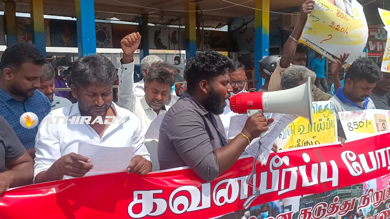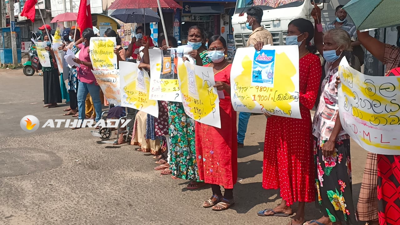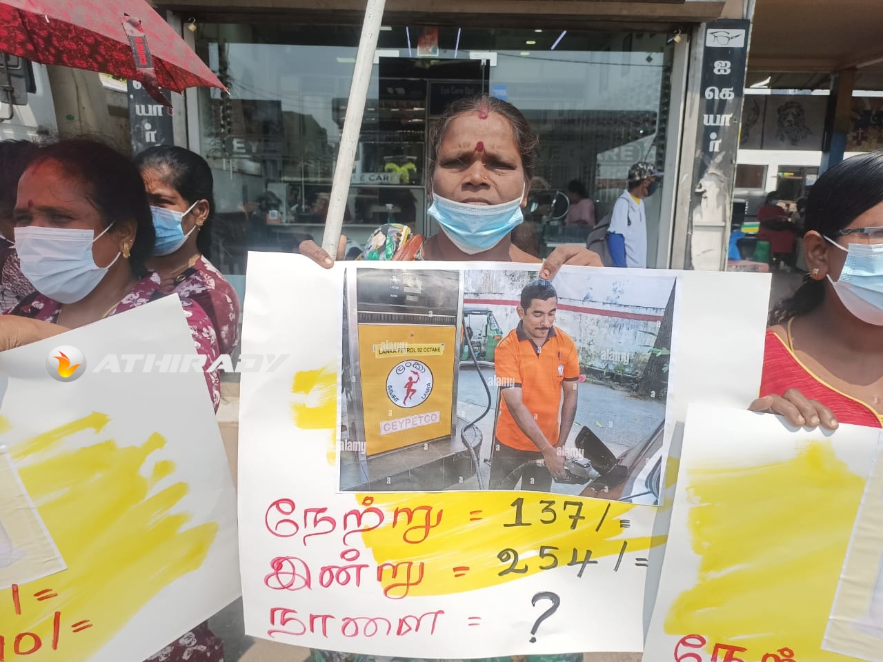 விலை உயர்வினை தடுத்து நிறுத்து , கட்டுப்பாட்டு விலையினை கொண்டு வா, உழைக்கும் மக்களை பட்டினிச்சாவுக்குள் தள்ளாதே , தாராள மயம் தனியார் மயம் தந்த பரிசுகளே இன்றைய அவலநிலை , என்ன வளம் இல்லை இந்த நாட்டில் ஏன் கை ஏந்த வேண்டும் அந்நிய நாட்டில் , அரசியலமைப்பை மாற்ற வேண்டும் தேசிய பொருளாதாரம் உருவாக வேண்டும் , நேற்று அங்கர் 980ரூபா இன்று 1900ரூபாவிற்கும் இல்லை , கோதுமை மா நேற்று 85ரூபா இன்று 190ரூபாவிற்கும் இல்லை , கடனுக்குள் தள்ளியோர் உல்லாசவாழ்வு நாட்டு மக்கள் பட்டினி சாவு போன்ற வசனங்களை தாங்கிய பதாதைகளை ஏந்தியவாறும் போராட்டத்தில் ஈடுபட்டனர்.