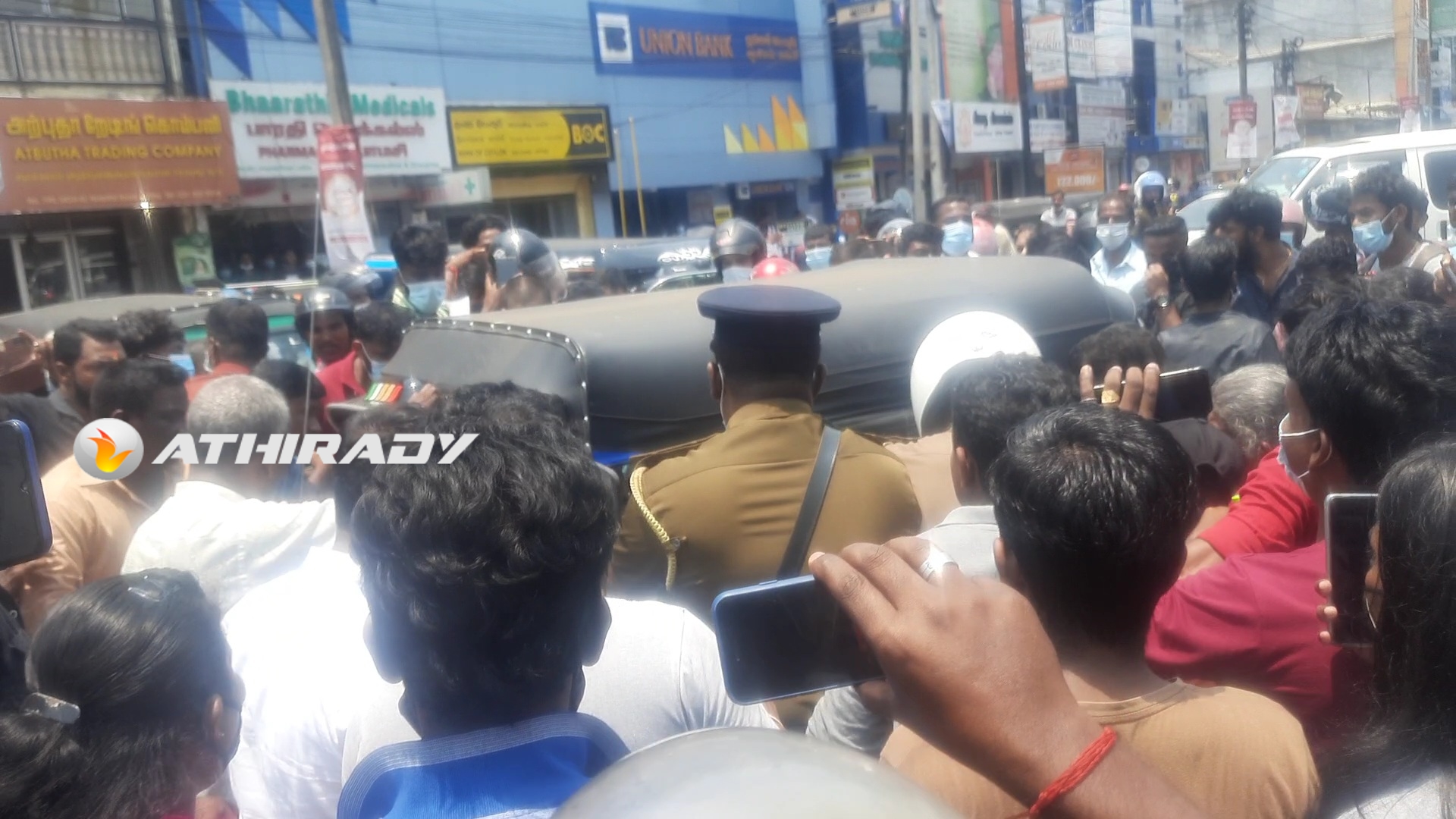 குழப்பத்தில் ஈடுபட்டவர்களை பொலிஸார் அங்கிருந்து பாதுகாப்பாக முச்சக்கர வண்டியில் அனுப்புவதற்கு முயற்சித்த வேளை போராட்டக்காரர்கள் முச்சக்கர வண்டியையும் முற்றுகையிட்டனர். பெரும் பிரயத்தனத்திற்கு மத்தியில் பொலிஸார் முச்சக்கர வண்டியை அங்கிருந்து அனுப்பி வைத்தனர்.