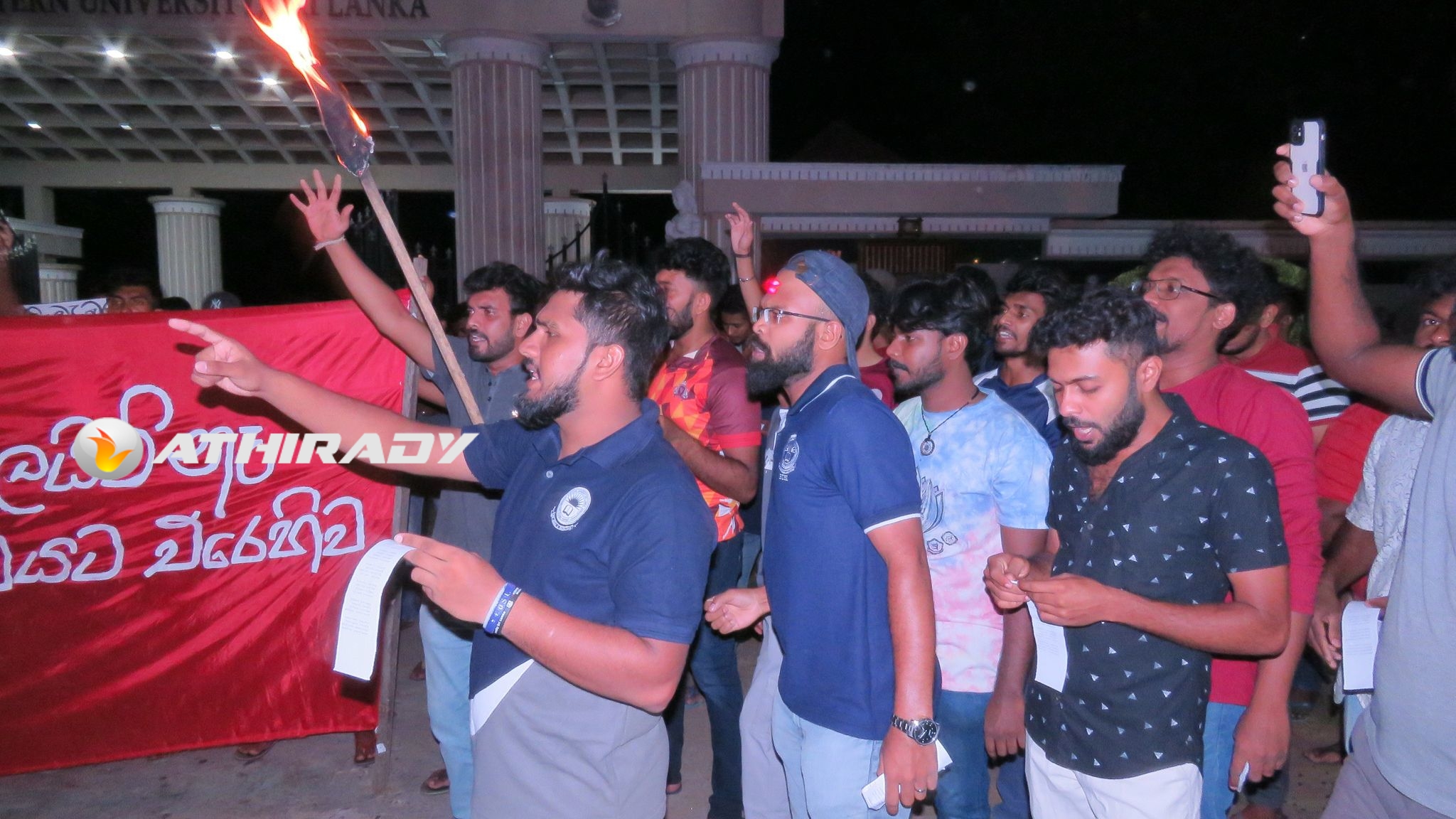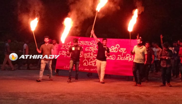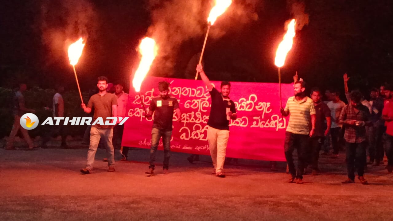 இதன் போது அவர்களை பல்கலைக்கழக வாசலில் வைத்து பொலிசார் தடுத்து நிறுத்தினர். இதனையடுத்து போராட்டகாரர்கள்; அரசுக்கு எதிராக பல்வேறு சுலோகங்களை தாங்கியவாறும், கோஷங்களை எழுப்பியவாறும் தீப்பந்தம் ஏந்தி சுமார் ஒரு மணித்தியாலம் போராட்டத்தில் ஈடுபட்ட பின்னர் அங்கிருந்து கலைந்து சென்றனர்.
