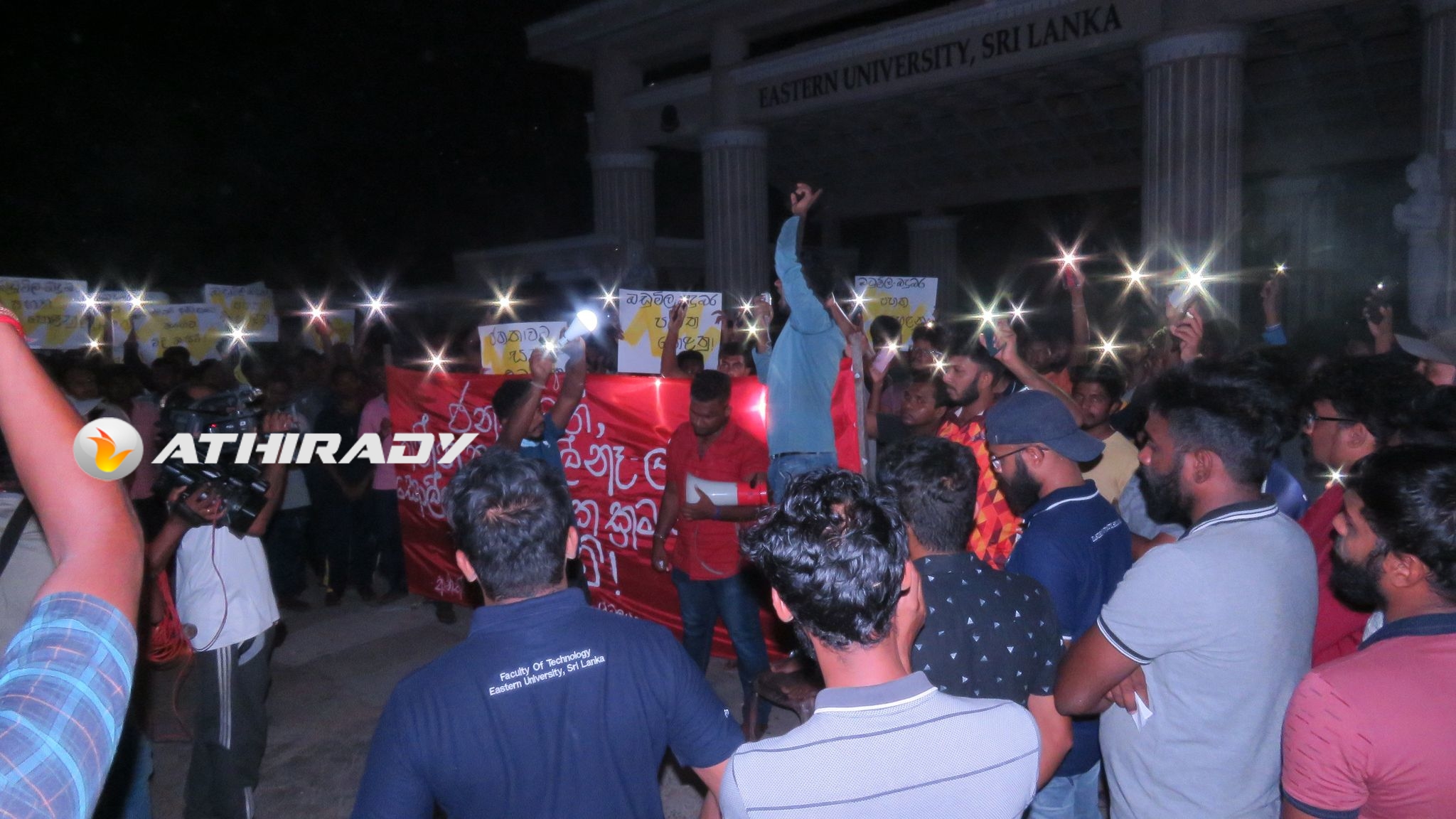 கிழக்கு பல்கலைக்கழக மாணவர் ஒன்றியத் தலைவர் சமன் தலைமையில் இரவு 7.15 மணிக்கு இடம்பெற்ற இப் பேராட்டத்தில் சுமார் நூற்றுக்கும் மேற்பட்ட மாணவர்கள் கலந்து கொண்டு ஊரடங்கு சட்டத்தை மீறி பல்கலைக்கழகத்தில் இருந்து செங்கலடிக்கு எதிர்ப்பு ஊர்வலமாக செல்ல முற்பட்டனர்.