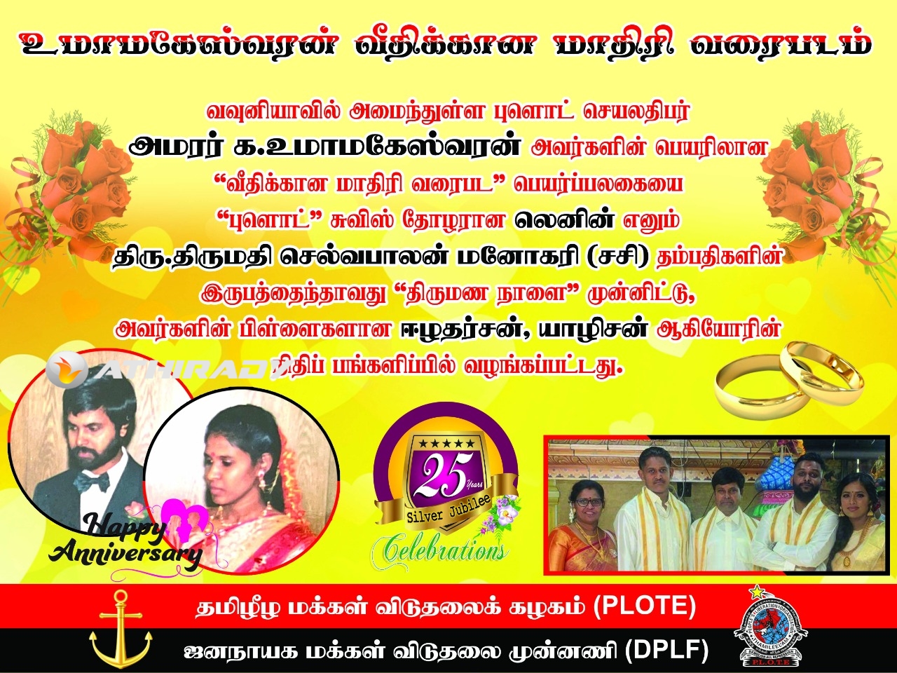 வவுனியாவில் அமைந்துள்ள புளொட் செயலதிபர் அமரர் க.உமாமகேஸ்வரன் அவர்களின் பெயரிலான “உமாமகேஸ்வரன் வீதி” வீதிக்கான மாதிரி வரைபடம் புளொட் சுவிஸ் தோழரான லெனின் எனும் திரு. திருமதி செல்வபாலன் மனோகரி (சசி) தம்பதிகளின் இருபத்தைந்தாவது திருமண நாளை முன்னிட்டு அவர்களின் பிள்ளைகளான ஈழதர்சன் யாழிசன் ஆகியோரின் நிதிப்பங்களிப்பில் நிறுவப்பட்டது. பெருமளவிலான நிதிச் செலவில் மேற்படி “உமாமகேஸ்வரன் வீதிக்கான” மாதிரி வரைபடம் அமைக்கப்பட்டது குறிப்பிடத்தக்கது.