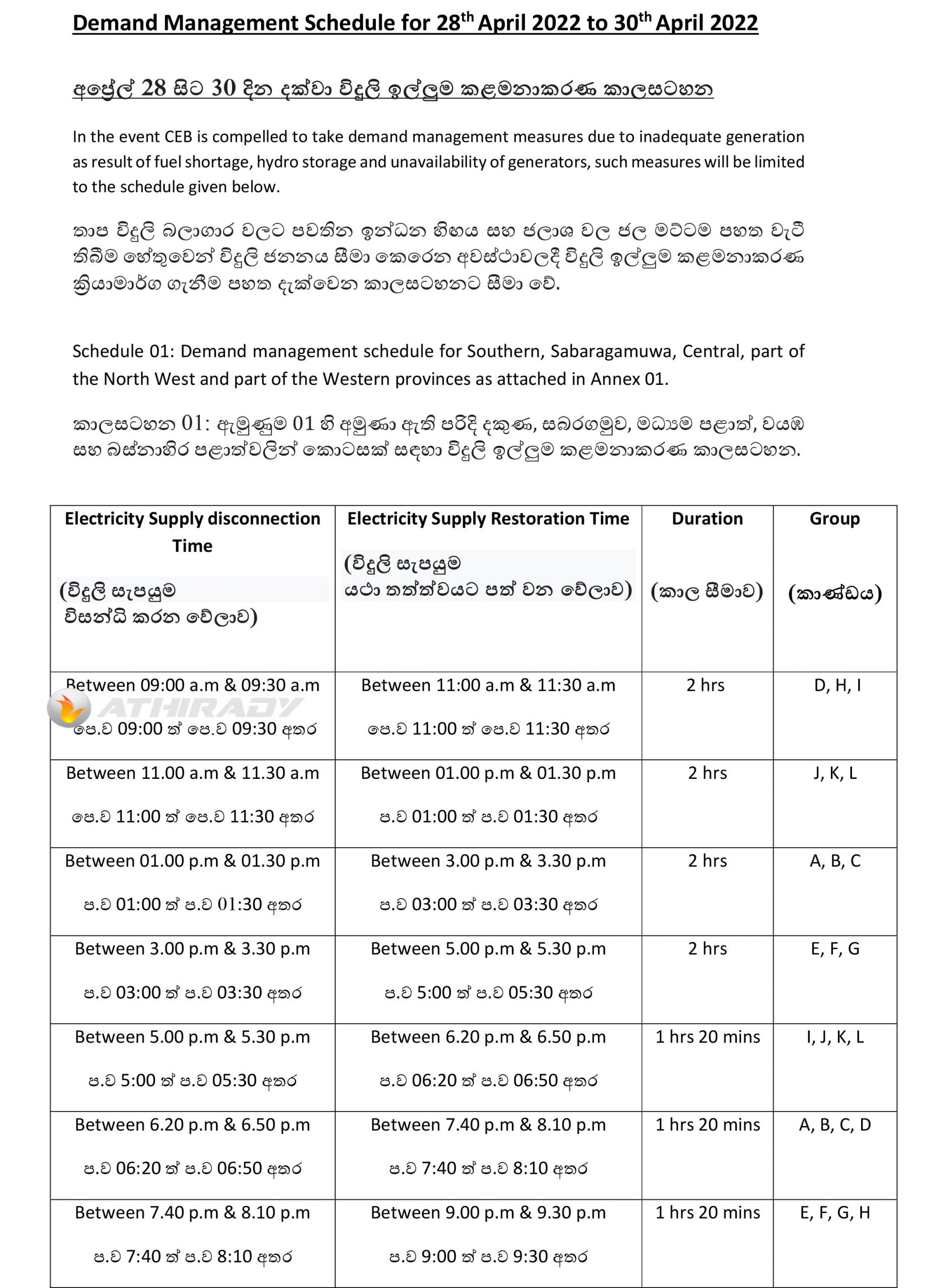 இதற்கமைய, எதிர்வரும் மூன்று நாட்களில் (28,29,30) நாடளாவிய ரீதியில் 3 மணித்தியாலங்களும் 20 நிமிடங்களும் மின்துண்டிப்பு மேற்கொள்ளப்படவுள்ளது.