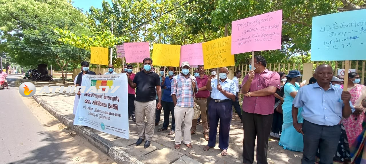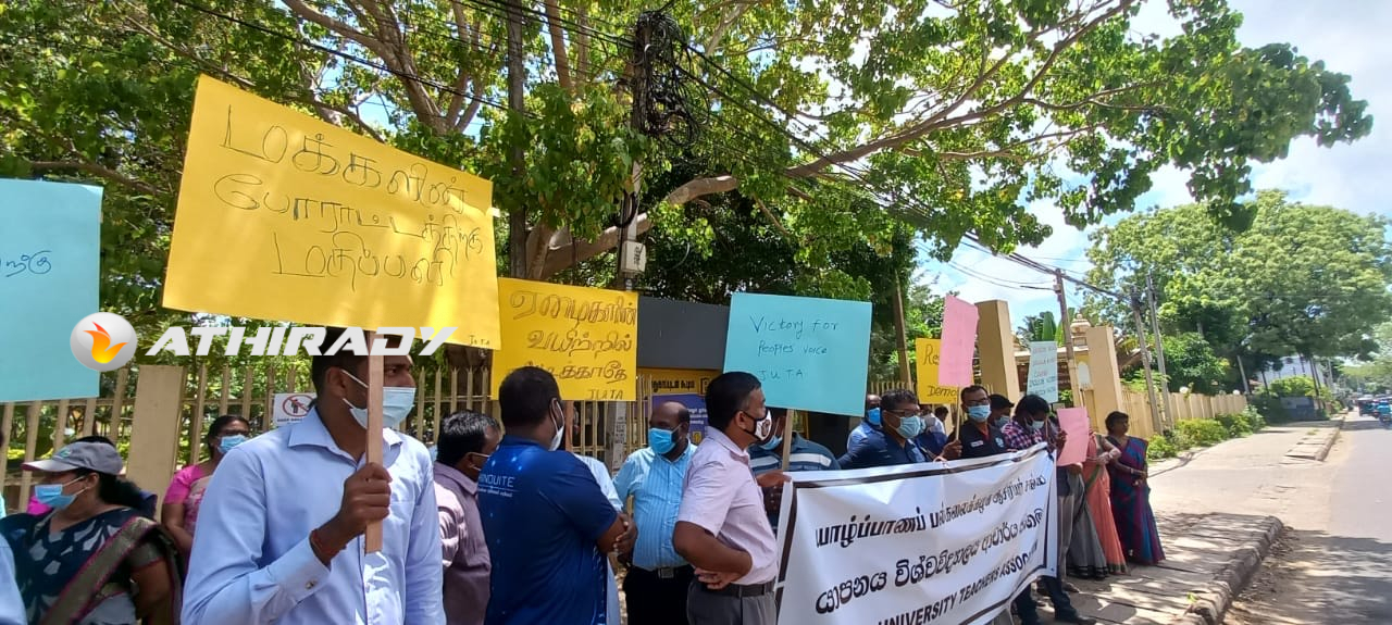 குறித்த போராட்டத்திற்கு வலு சேர்க்கும் வகையில் யாழ்ப்பாண பல்கலைகழக ஆசிரியர் சங்கம் மற்றும் ஊழியர் சங்கம் என்பன யாழ் பல்கலைகழக முன்றலில் போராட்டத்தில் ஈடுபட்டனர்.