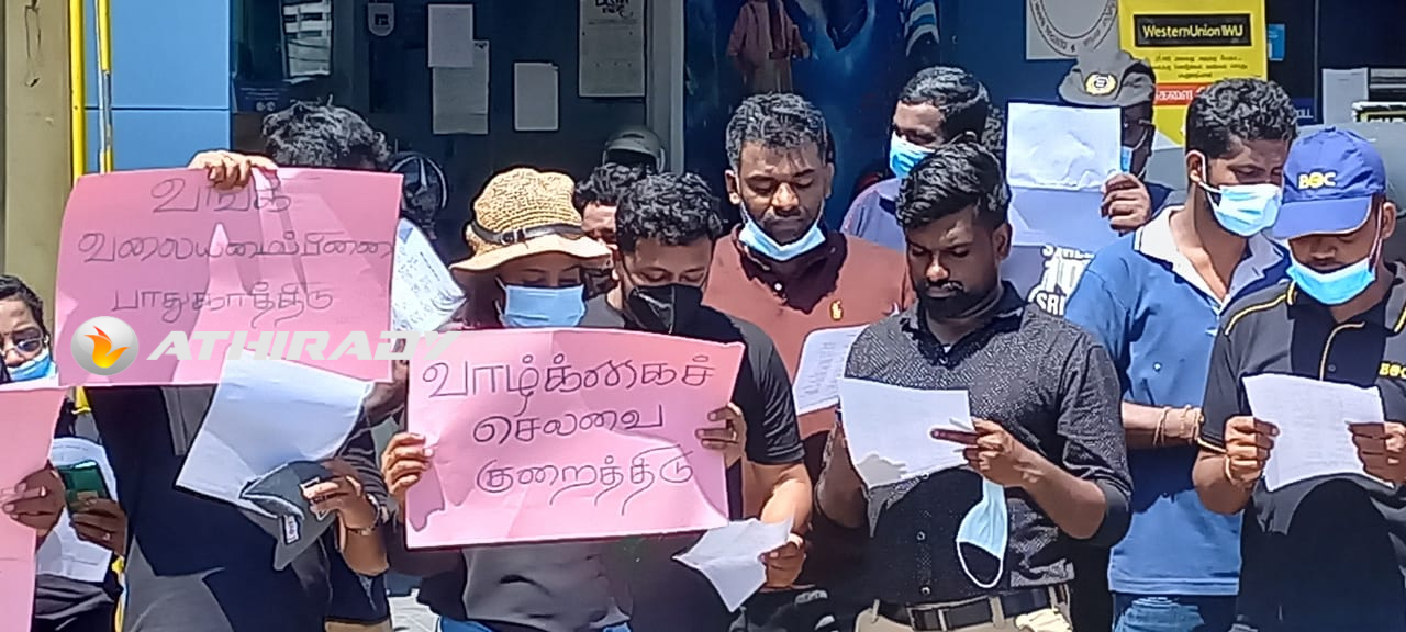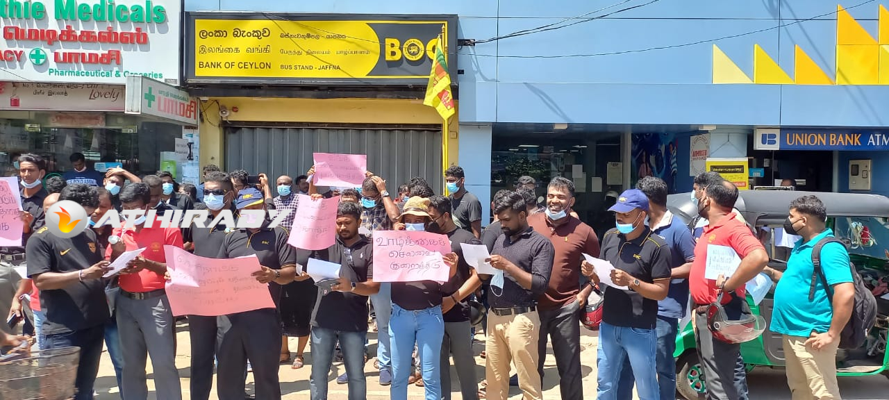 இலங்கை வங்கி ஊழியர் சங்கத்தினரின் ஏற்பாட்டில், யாழ்ப்பாண மத்திய பேருந்து நிலையம் முன்பாக இன்றைய தினம் வியாழக்கிழமை போராட்டம் முன்னெடுக்கப்பட்டது.