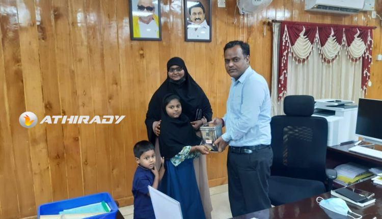 ராமநாதபுரம் மாவட்டம் கீழக்கரை பகுதியை சேர்ந்த பில்சா சாரா எனும் மாணவி வீட்டில் தனக்கென உண்டியலில் சேர்த்து வந்த 4400 இந்திய ரூபாய் பணத்தினை ராமநாதபுரம் மாவட்ட ஆட்சியர் சங்கர் லால் குவமத்திடம் வழங்கியுள்ளார்.