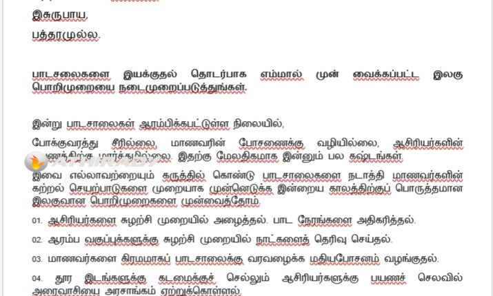 அக்கடிதத்தில்,இன்று பாடசாலைகள் ஆரம்பிக்கபட்டுள்ள நிலையில்,