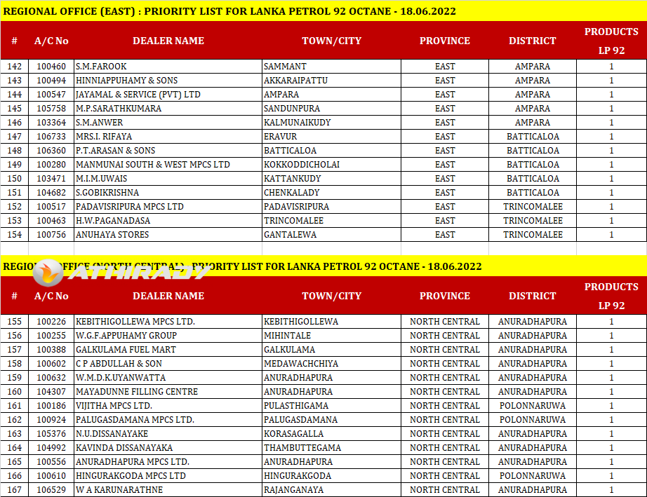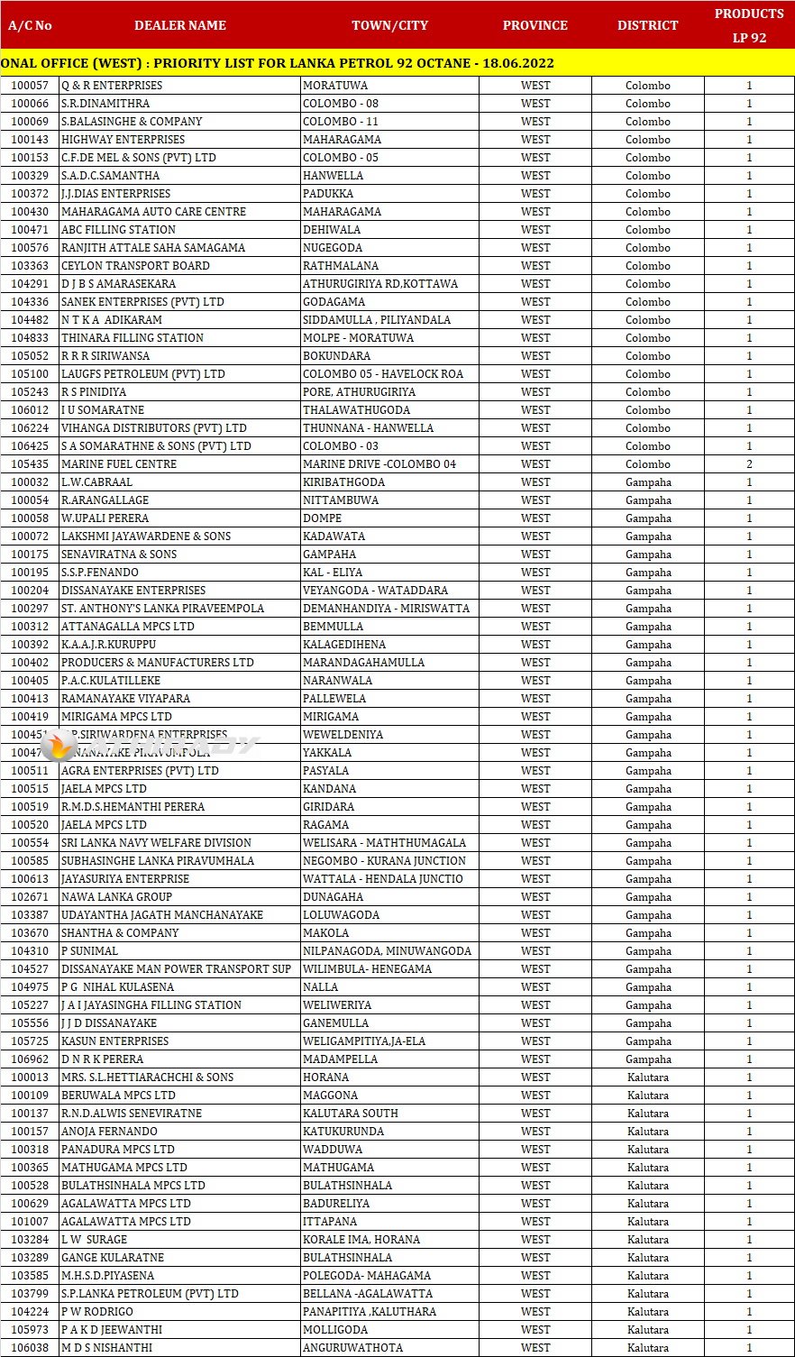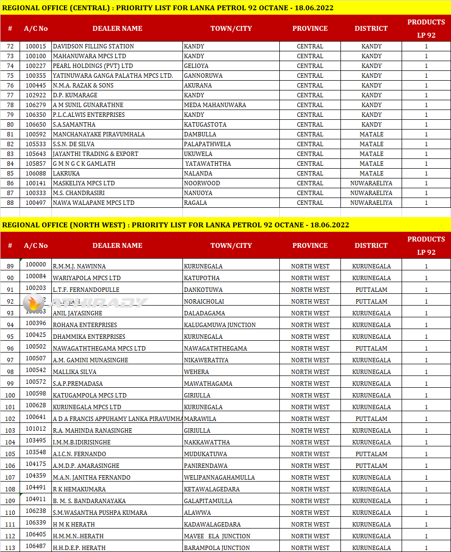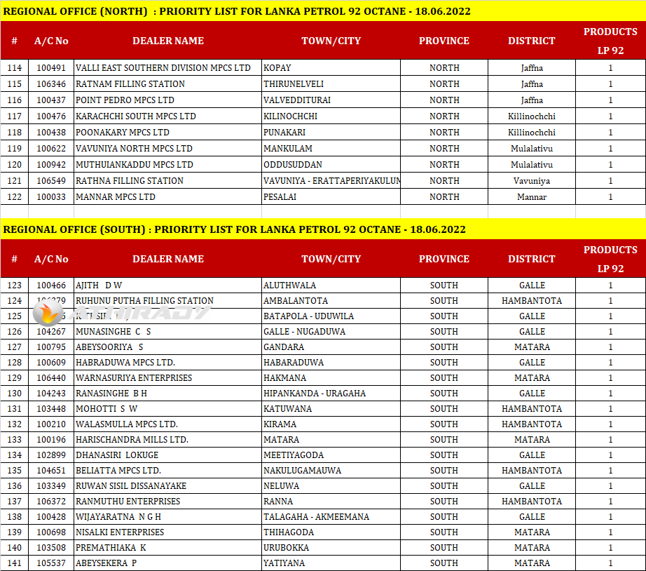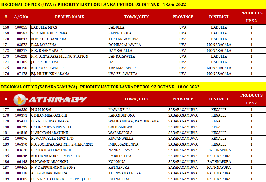 இன்று (18.06.2022) ஒக்டேன் 92 ரக பெற்றோல் விநியோகிக்கப்படும் எரிபொருள் நிரப்பு நிலையங்களின் பட்டியலை இலங்கை பெற்றோலியக் கூட்டுத்தாபனம் (CPC) வெளியிட்டுள்ளது.