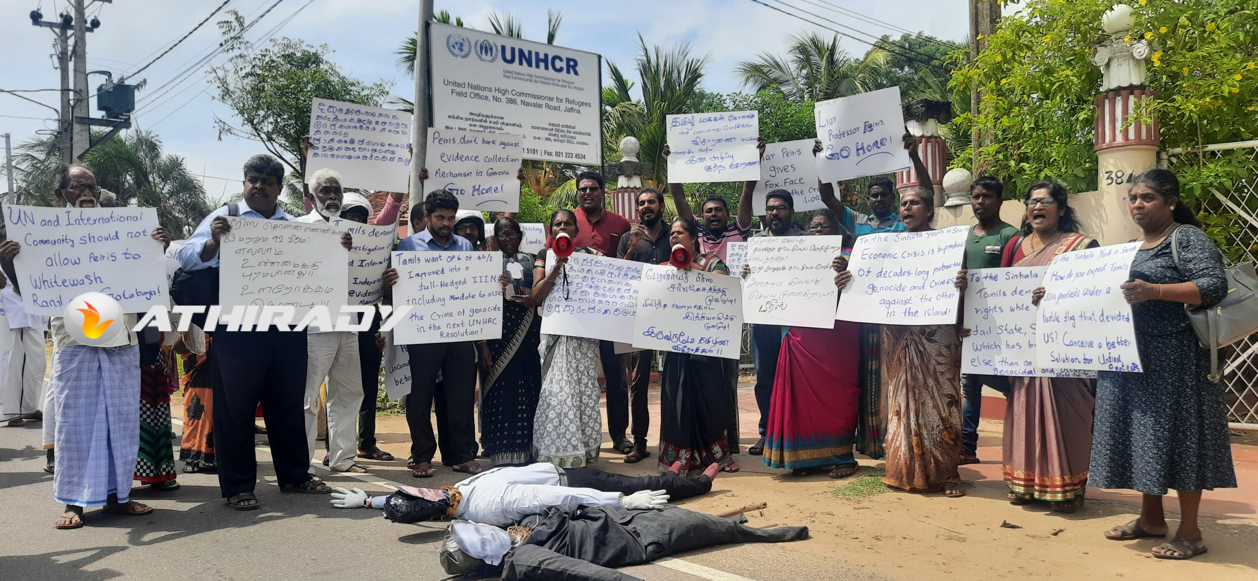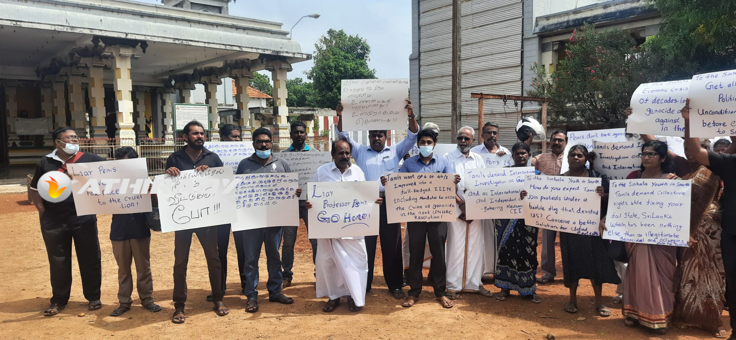 அரசாங்கம் தவறான கருத்துக்களை ஐக்கிய நாடுகள் மனித உரிமைகள் பேரவையில் தெரிவித்துள்ளதாக கூறி அதற்கு எதிராக இன்று ஞாயிற்றுக்கிழமை காலை நல்லூர் கைலாச பிள்ளையார் ஆலயத்திற்கு முன்பாக ஒன்றுகூடிய போராட்டக்காரர்கள் பேரணியாக ஜக்கிய நாடுகள் அலுவலகத்திற்கு வந்தடைந்தனர்.