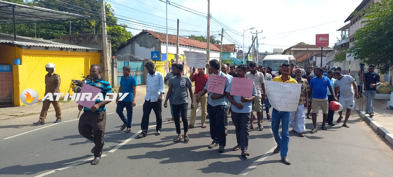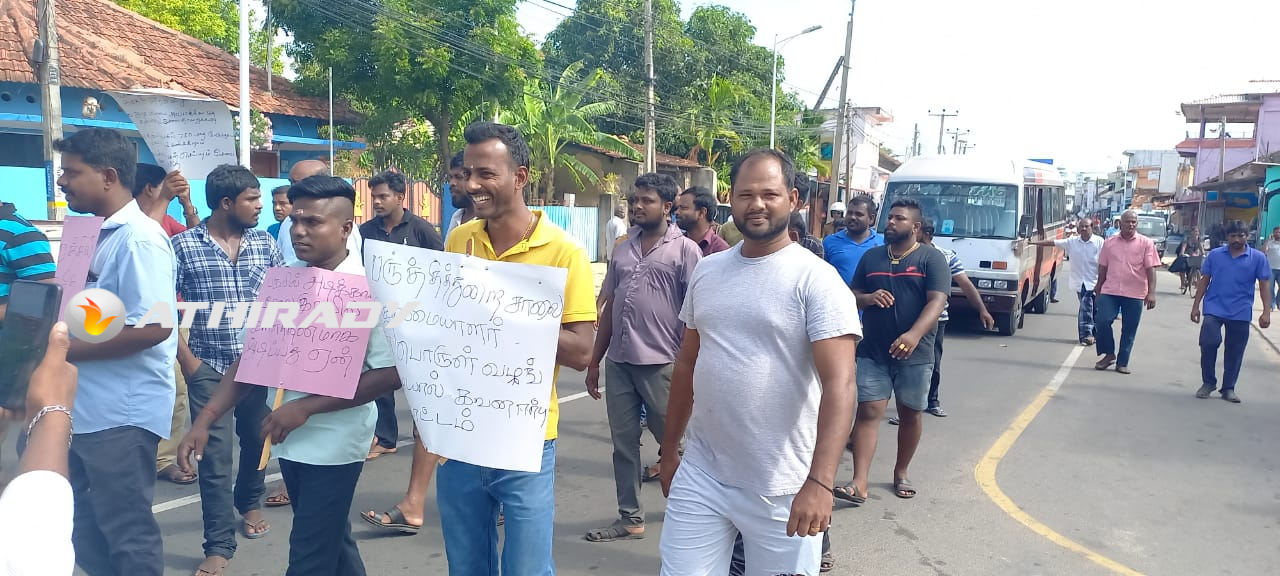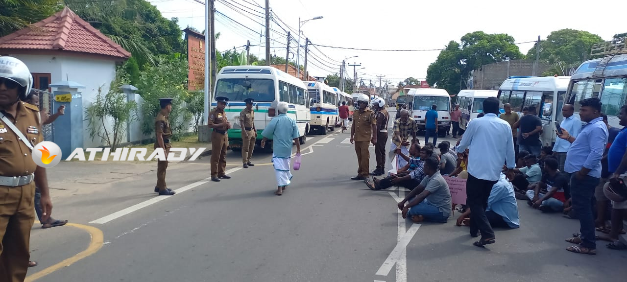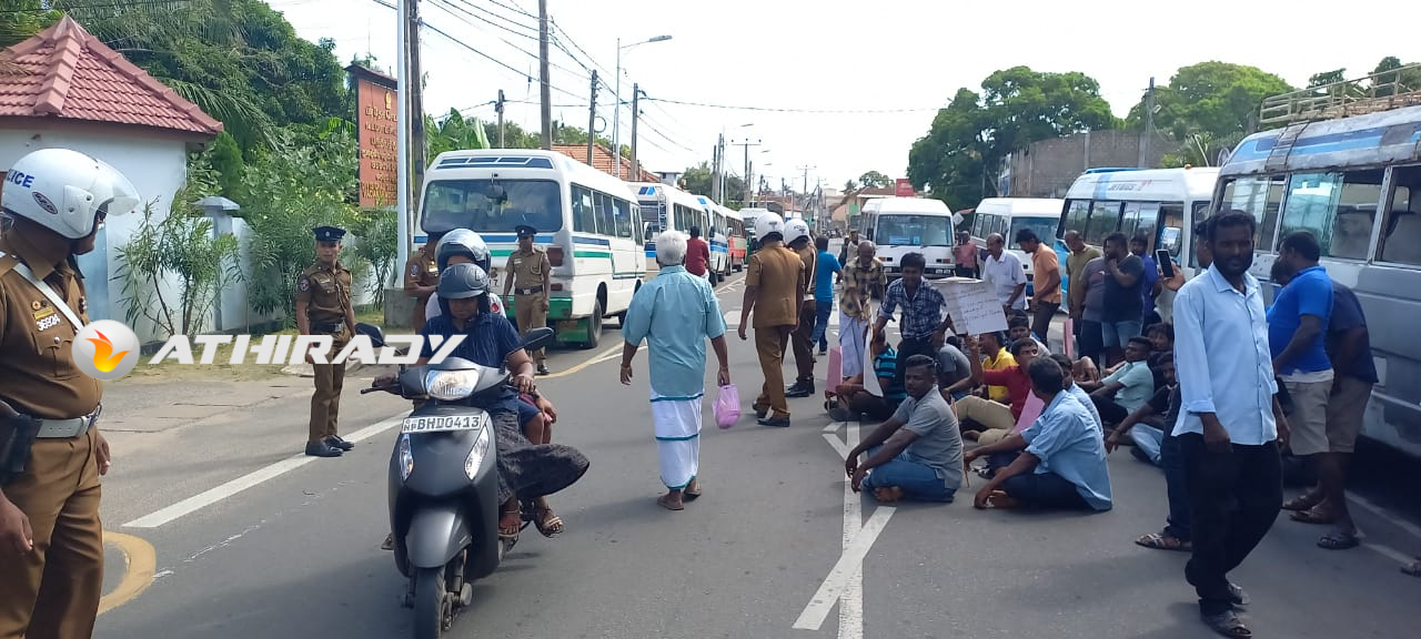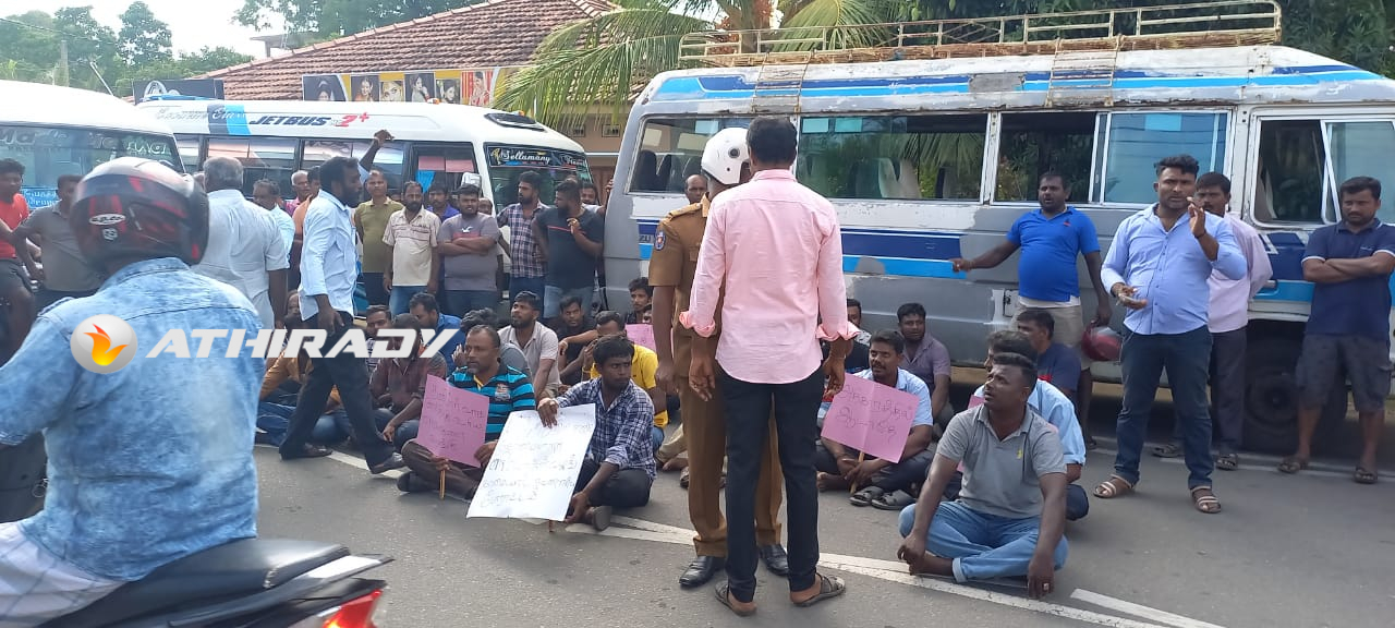 யாழ்ப்பாணம் பருத்தித்துறை சாலை (டிப்போ) எரிபொருள் நிரப்பு நிலையத்தில் இரவு நேரங்களில் கள்ள சந்தையில் விற்பனை செய்வதற்கு டீசல் வழங்கப்படுவதாகவும் , தமக்கு உரிய ஒழுங்கில் வழங்கப்படுவதில்லை என தெரிவித்து தனியார் பேருந்து உரிமையாளர்கள் , சாரதிகள் , நடத்துனர்கள் போராட்டத்தில் ஈடுபட்டனர்.