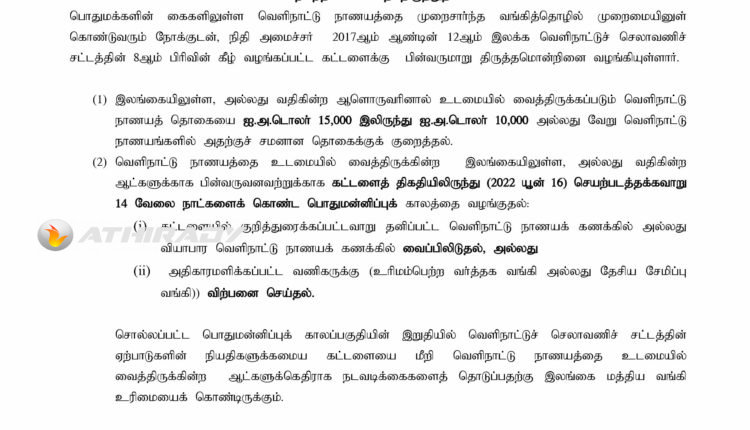 இலங்கையில் ஒருவர் வைத்திருக்கக்கூடிய வெளிநாட்டு நாணயத்தின் அதிகபட்ச வரம்பு 15,000 அமெரிக்க டொலர்களில் இருந்து 10,000 அமெரிக்க டொலர்களாக குறைக்கப்பட்டுள்ளது.