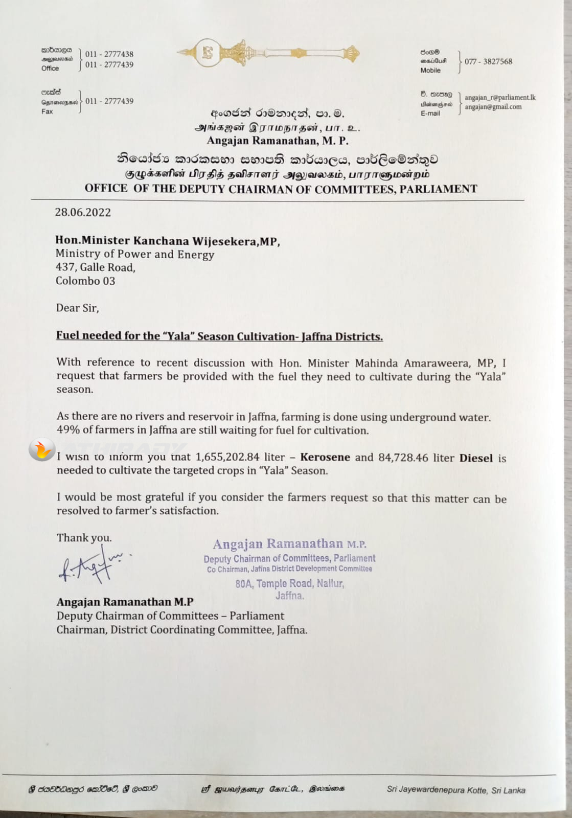 யாழ் மாவட்ட சிறுபோக அறுவடைக்கு 1,655,202.84 லீற்றர் மண்ணெண்ணெய் மற்றும் 84,728.46 லீற்றர் டீசல் உடனடியாக தேவைப்படும்நிலையில் விவசாயிகளின் நலன்கருதி அவற்றை உடனடியாக வழங்க ஏற்பாடுகளை செய்யுமாறு கோரிக்கை விடுத்துள்ளார்.
